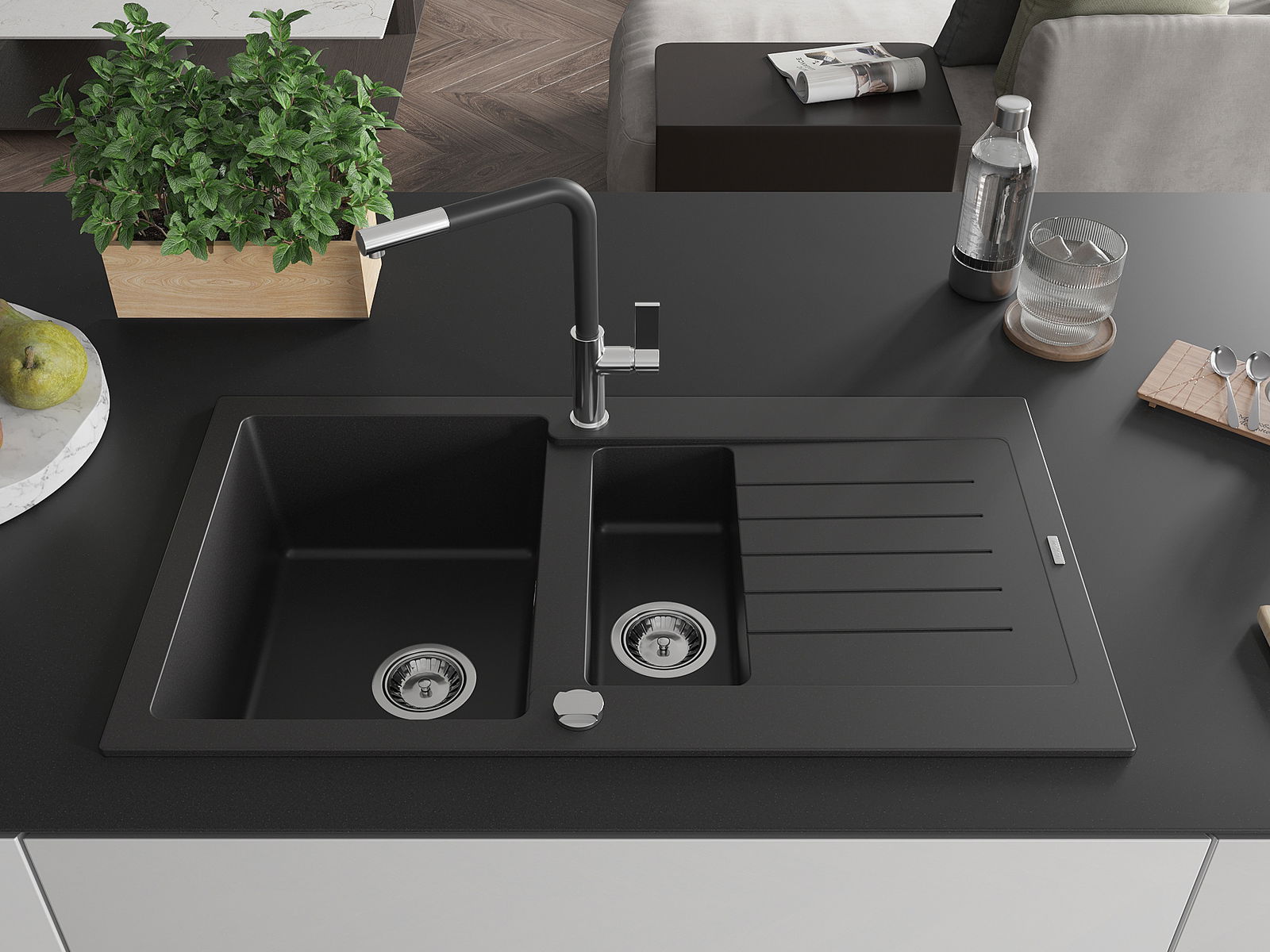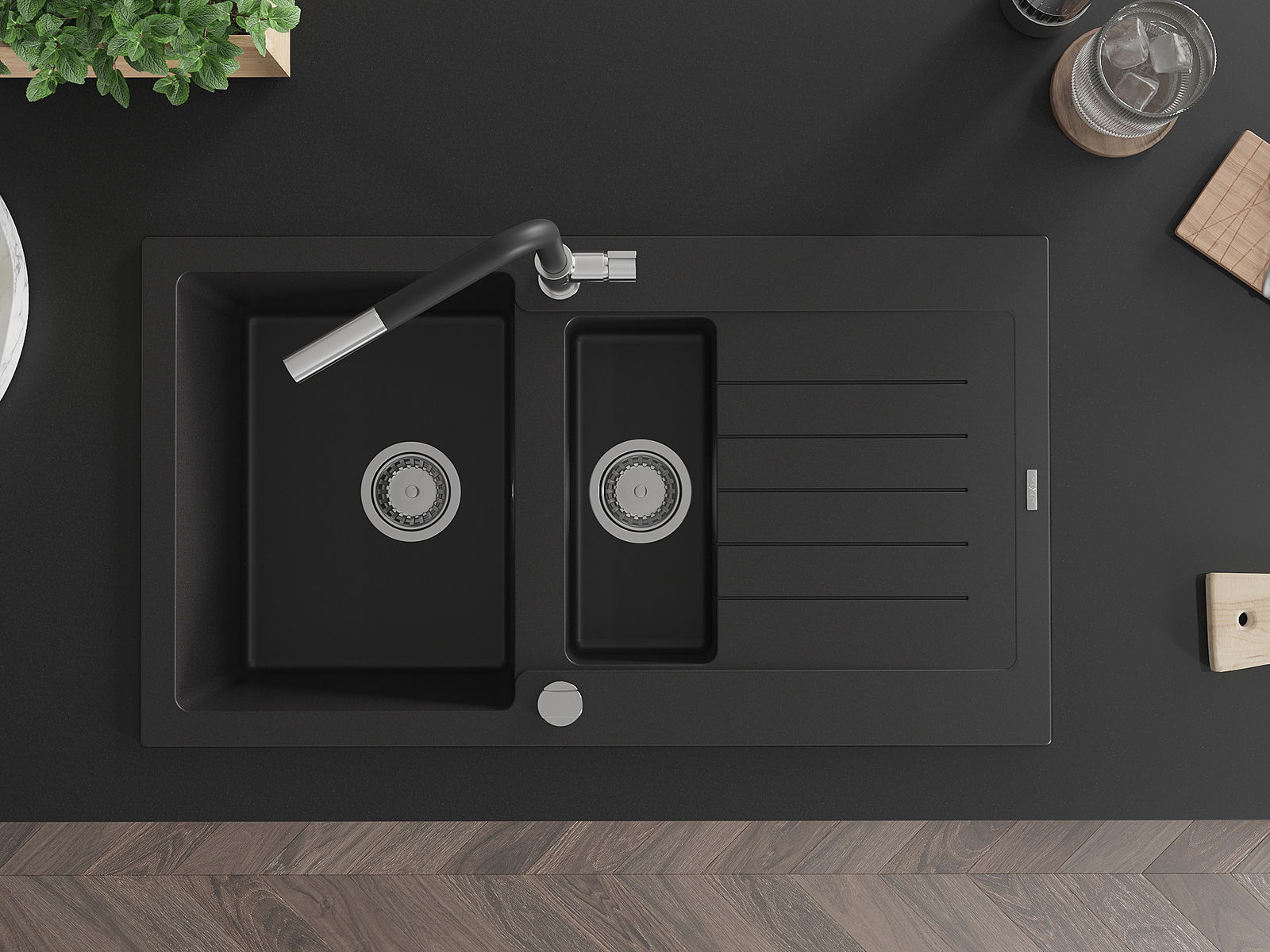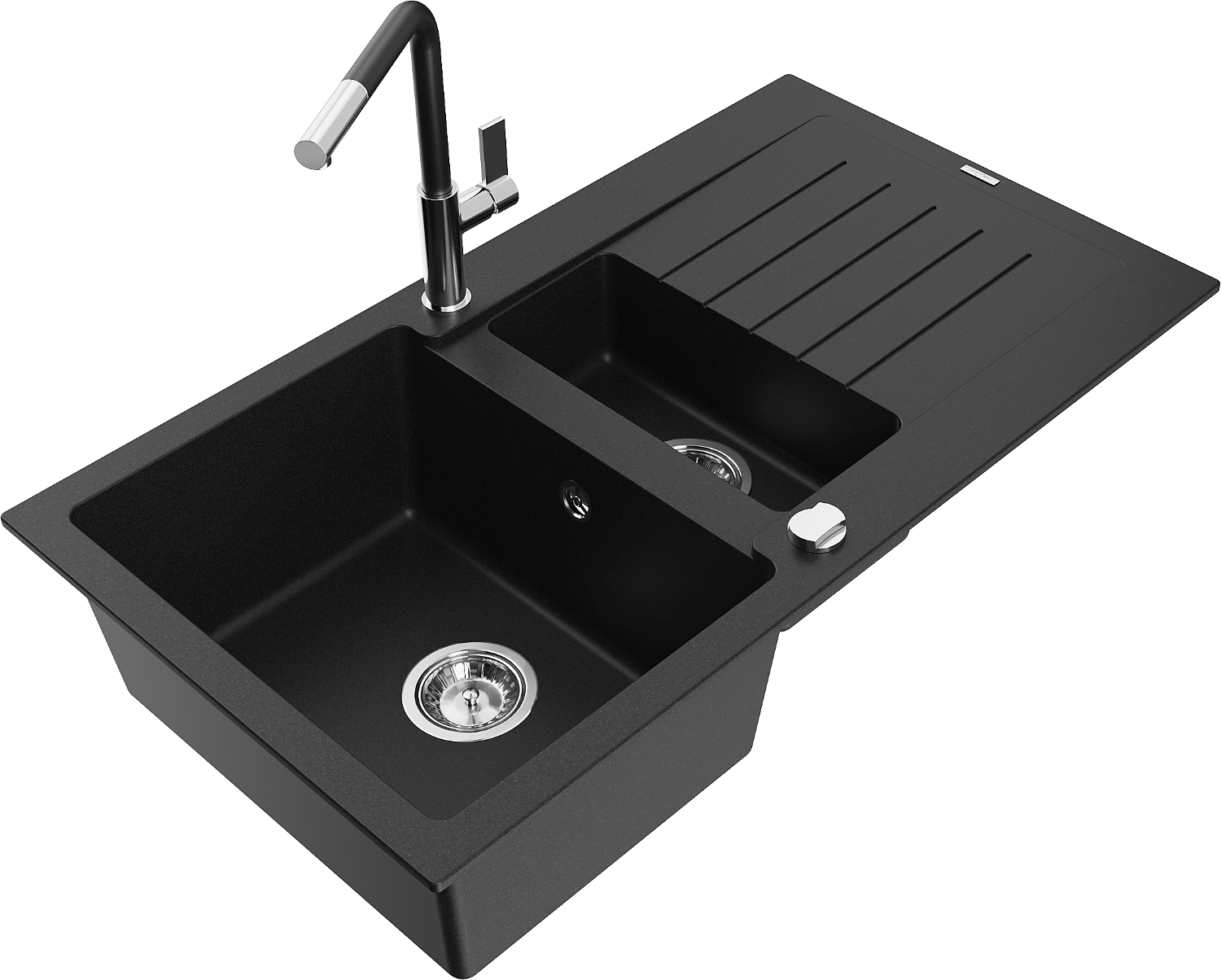 Mexen Matias granieten gootsteen 1,5-kamer met afdruiprek en keukenmengkraan Flora, zwart - 6502-77-670401-07