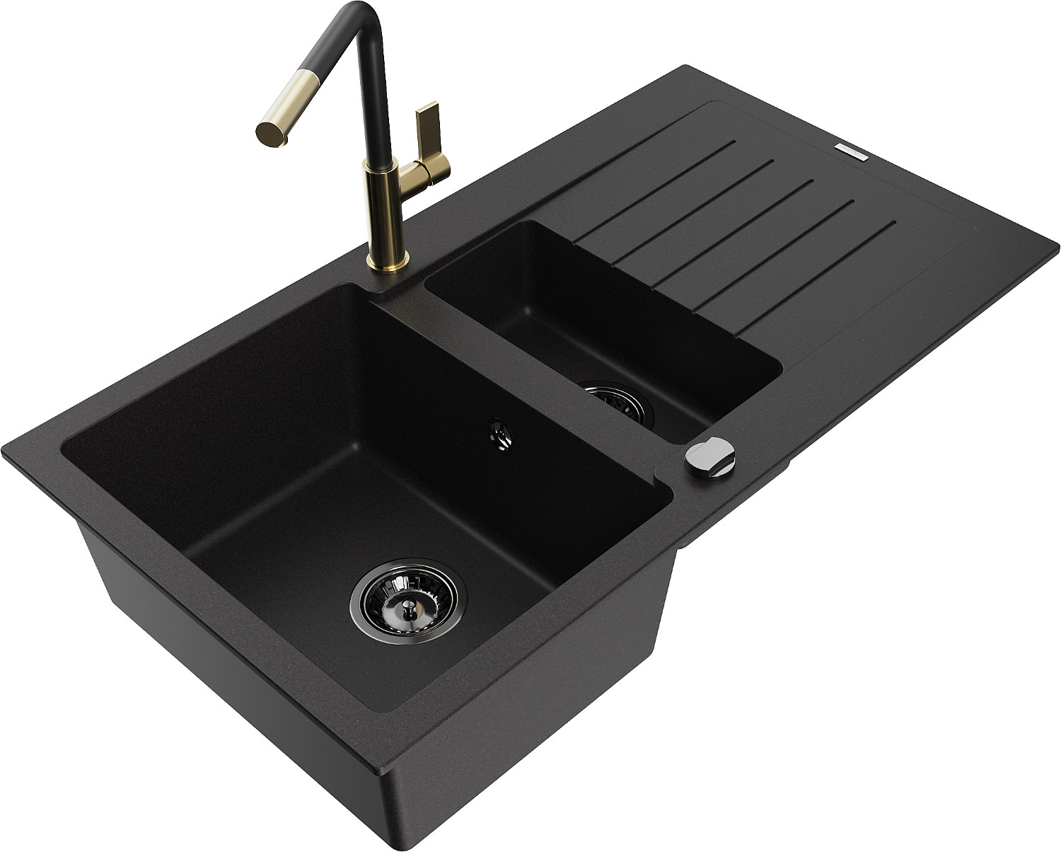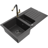 Mexen Matias granieten spoelbak 1,5-komor met afdruiprek en keukenkraan Flora, zwart - 6502-77-670401-57-B