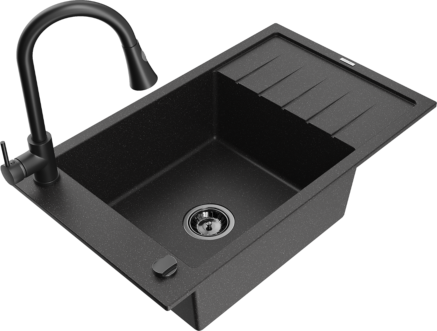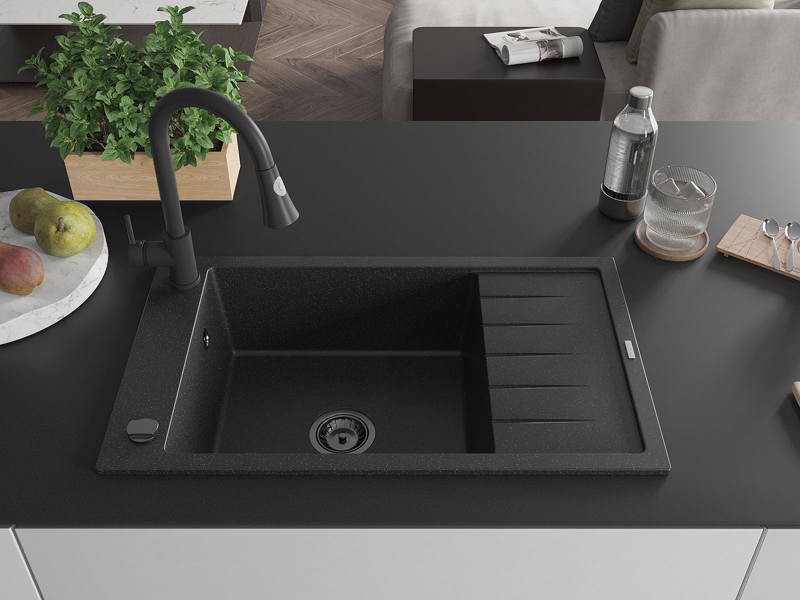 Mexen Elias granieten spoelbak 1-kompartiment met afdruiprek en keukenkraan Elia, zwart/zilver metallic - 6511-73-670101-70-B