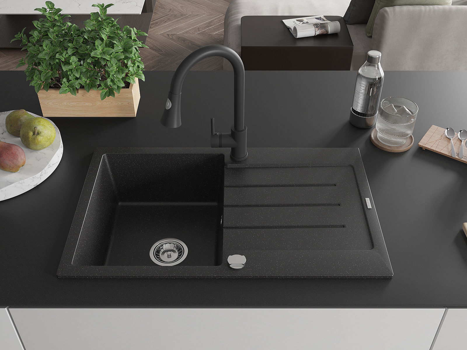 Mexen Bruno granieten spoelbak 1-komorige met afdruiprek en keukenmengkraan Elia, zwart/zilver metallic - 6513-73-670101-70