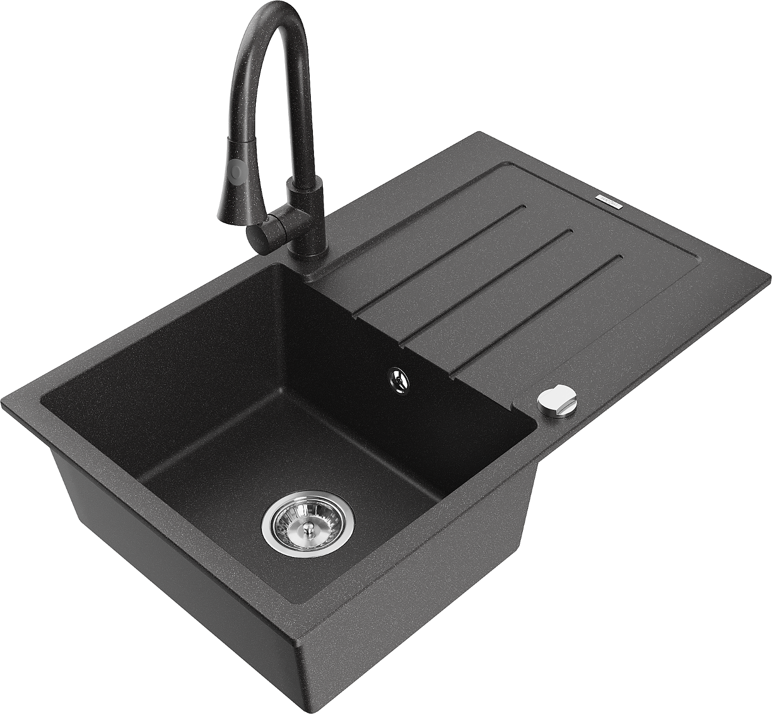Mexen Bruno granieten gootsteen met een enkele bak met afdruiprek en keukenkraan Elia, zwart gespikkeld - 6513-76-670101-76