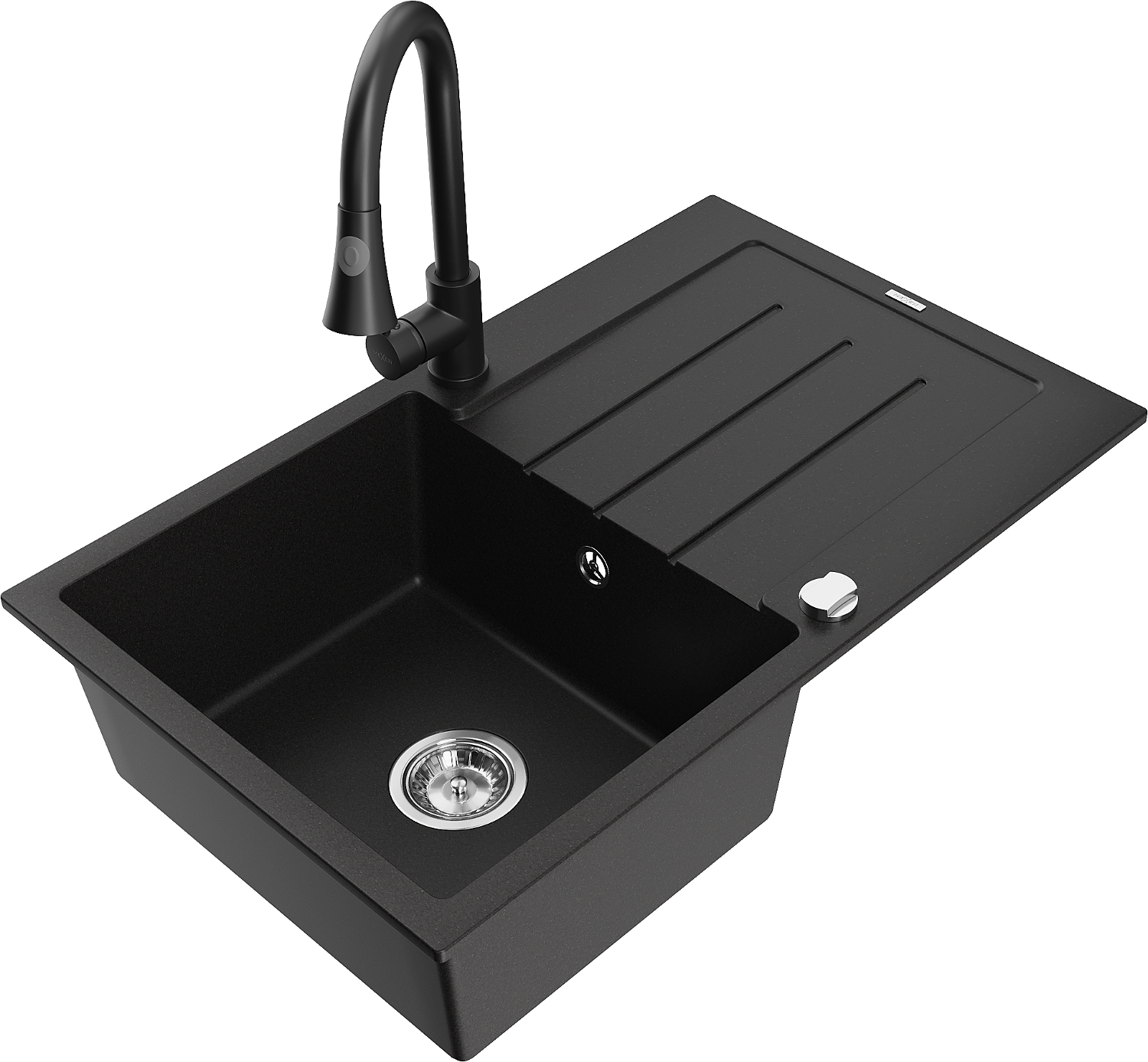 Mexen Bruno granieten gootsteen, 1-komorige met afdruiprek en keukenkraan Elia, zwart - 6513-77-670101-70