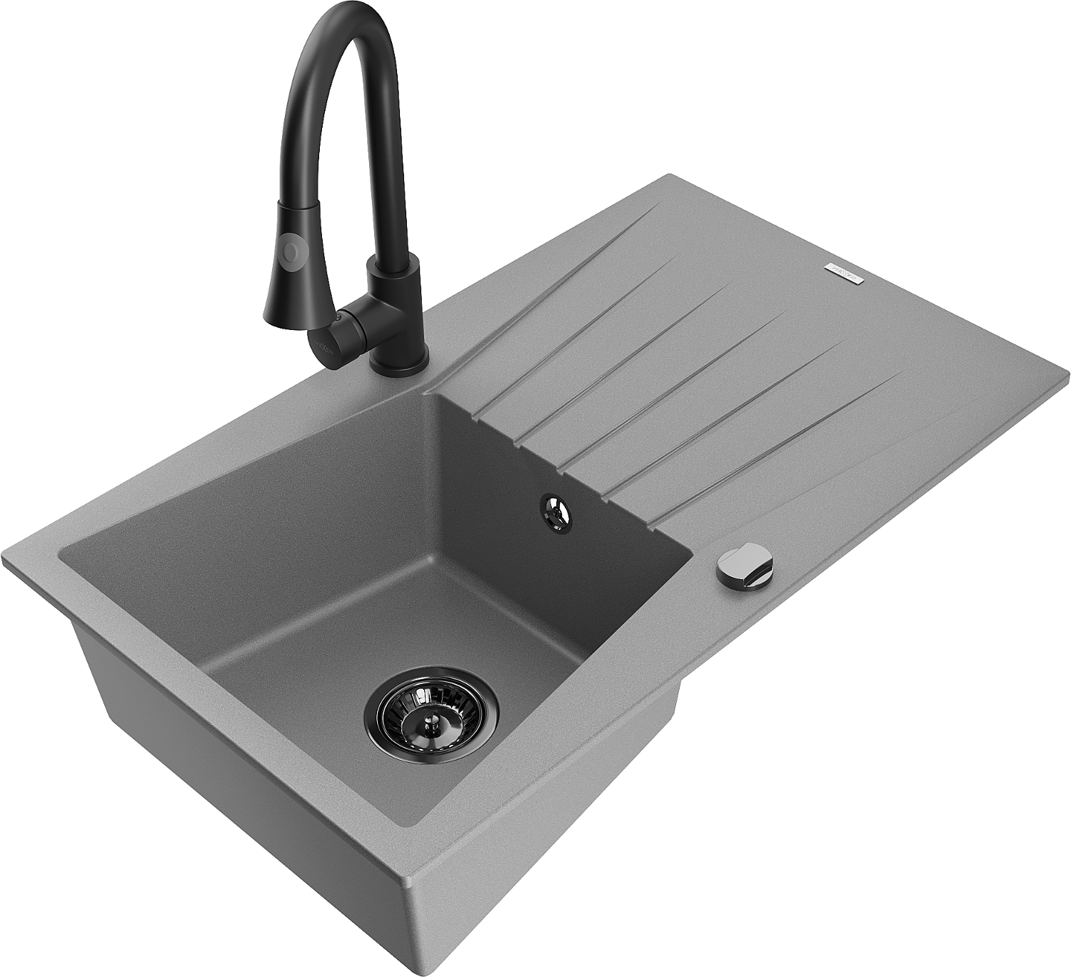 Mexen Cesar granieten gootsteen 1-komor met afdruiprek en keukenmengkraan Elia, grijs - 6514-71-670101-70-B