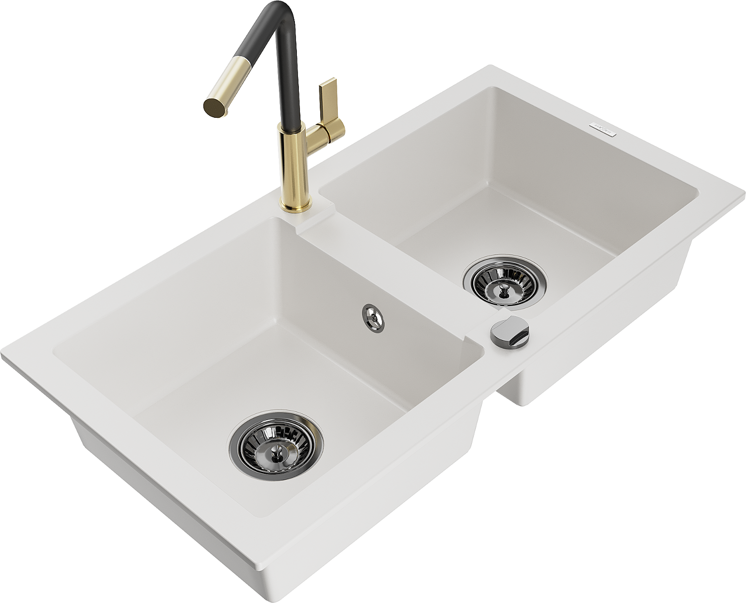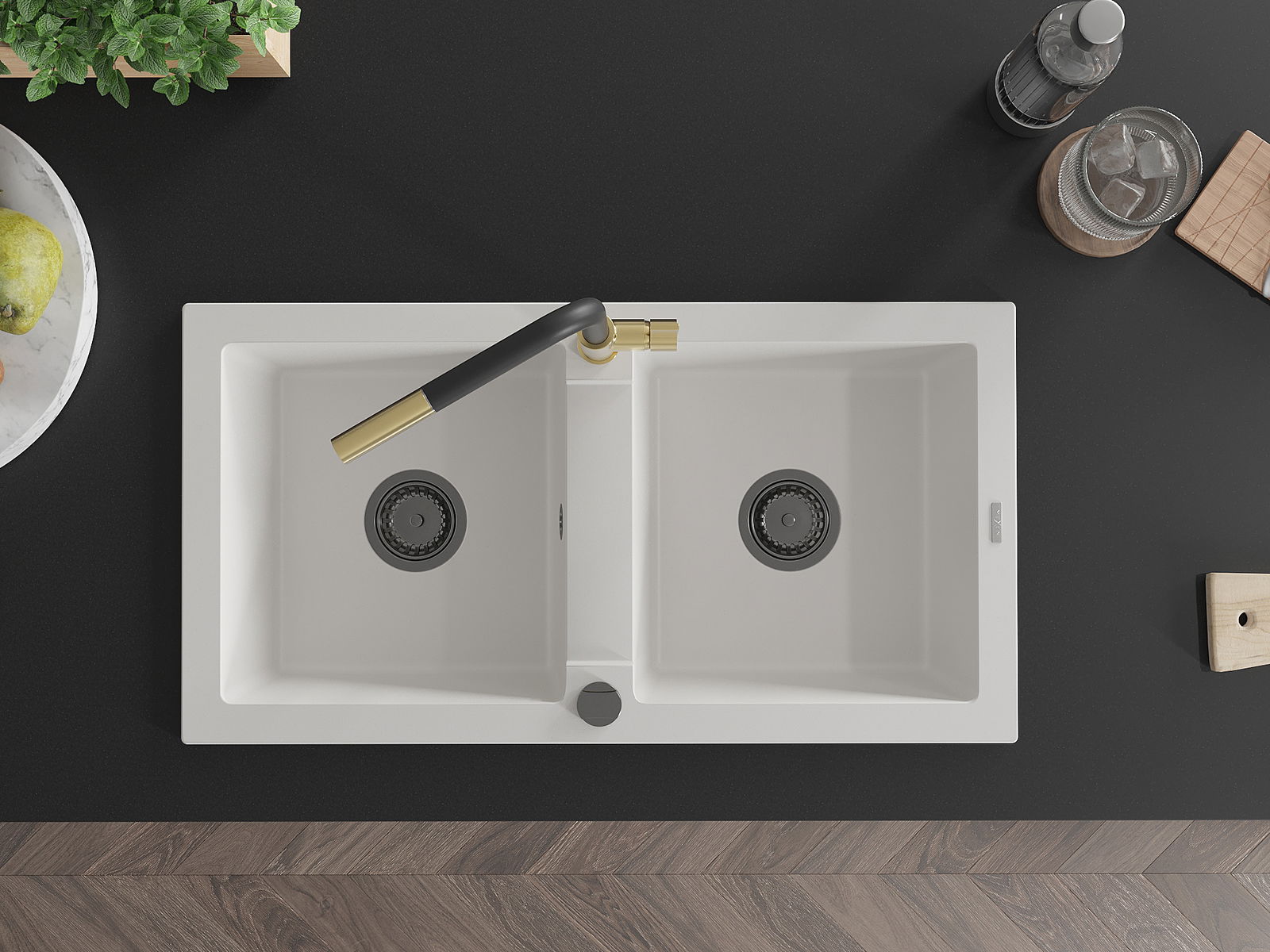 Mexen Mario granieten spoelbak 2-kamer met keukenkraan Flora, wit - 6504-20-670401-57-B
