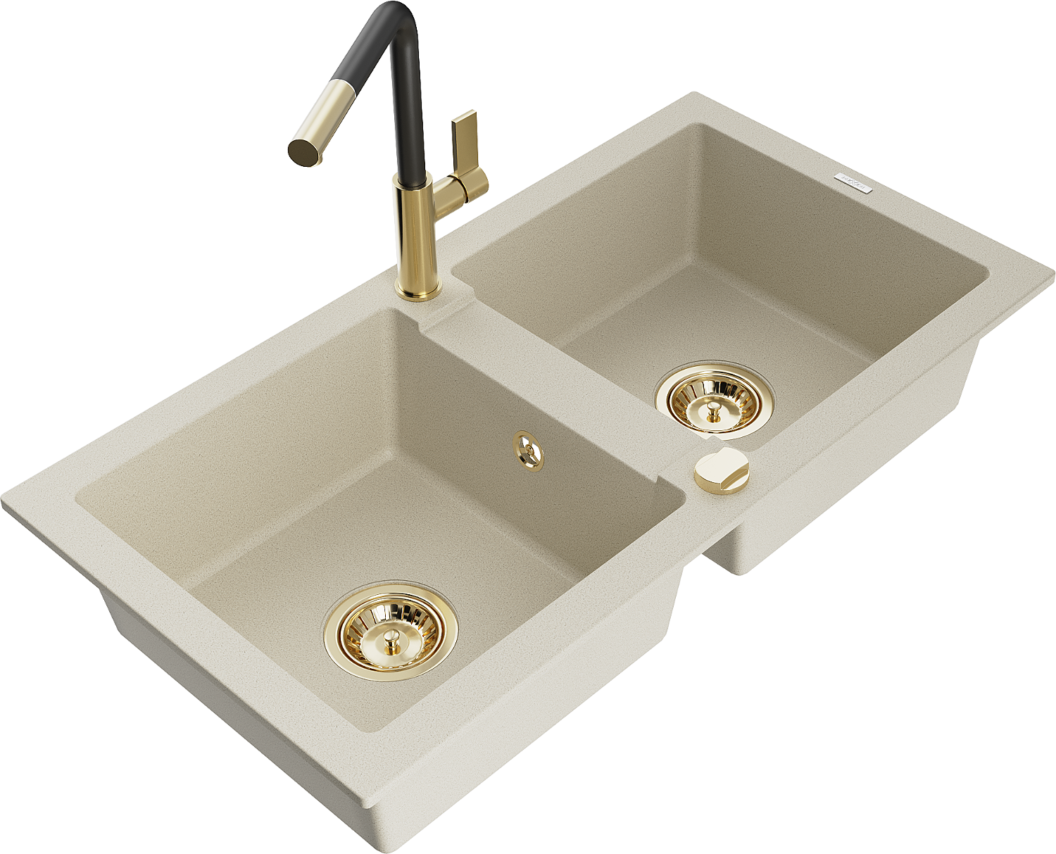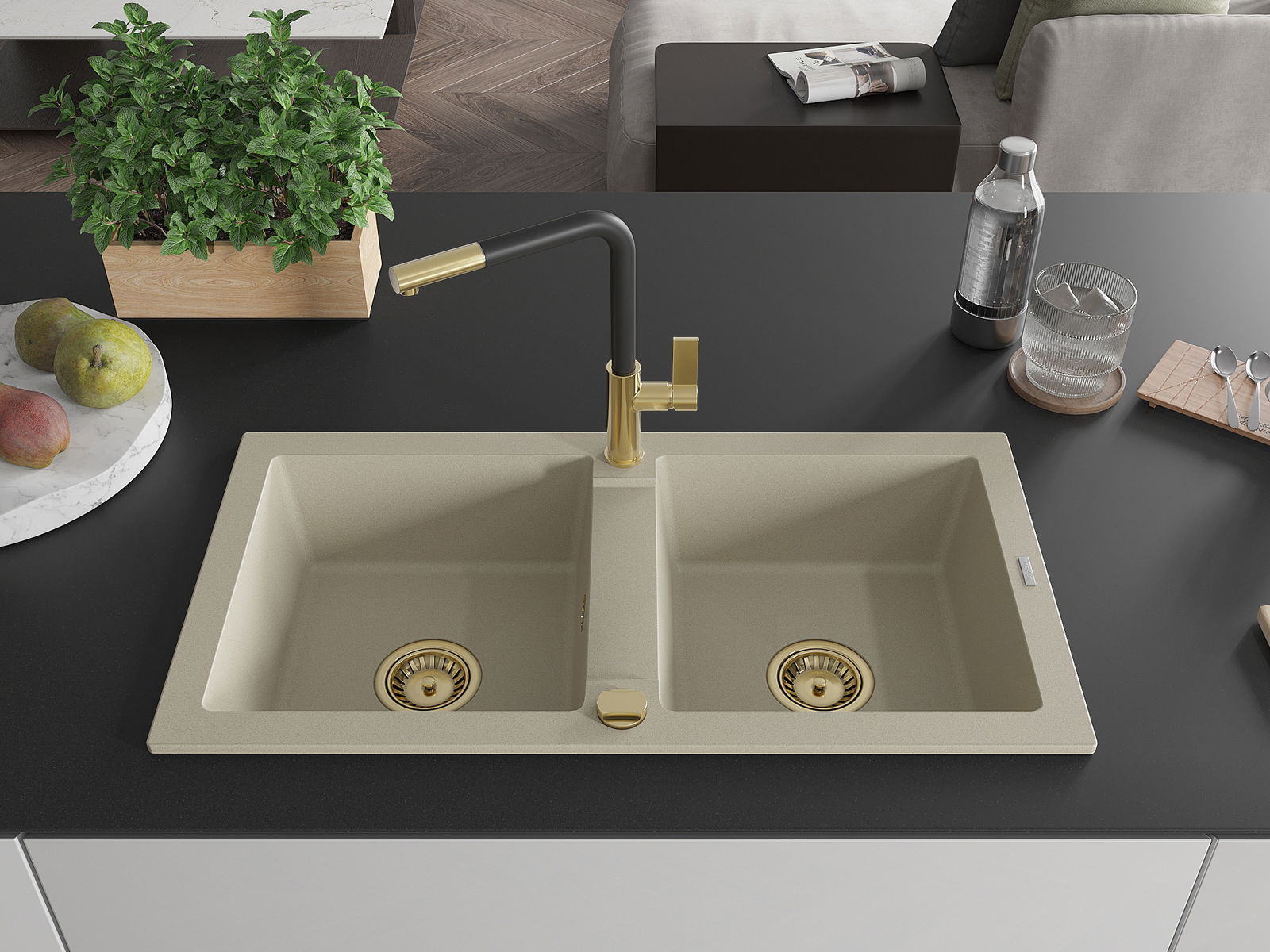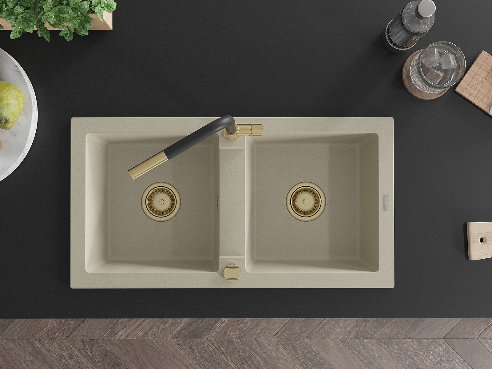 Mexen Mario granieten spoelbak 2-kamer met keukenmengkraan Flora, beige - 6504-69-670401-57-G
