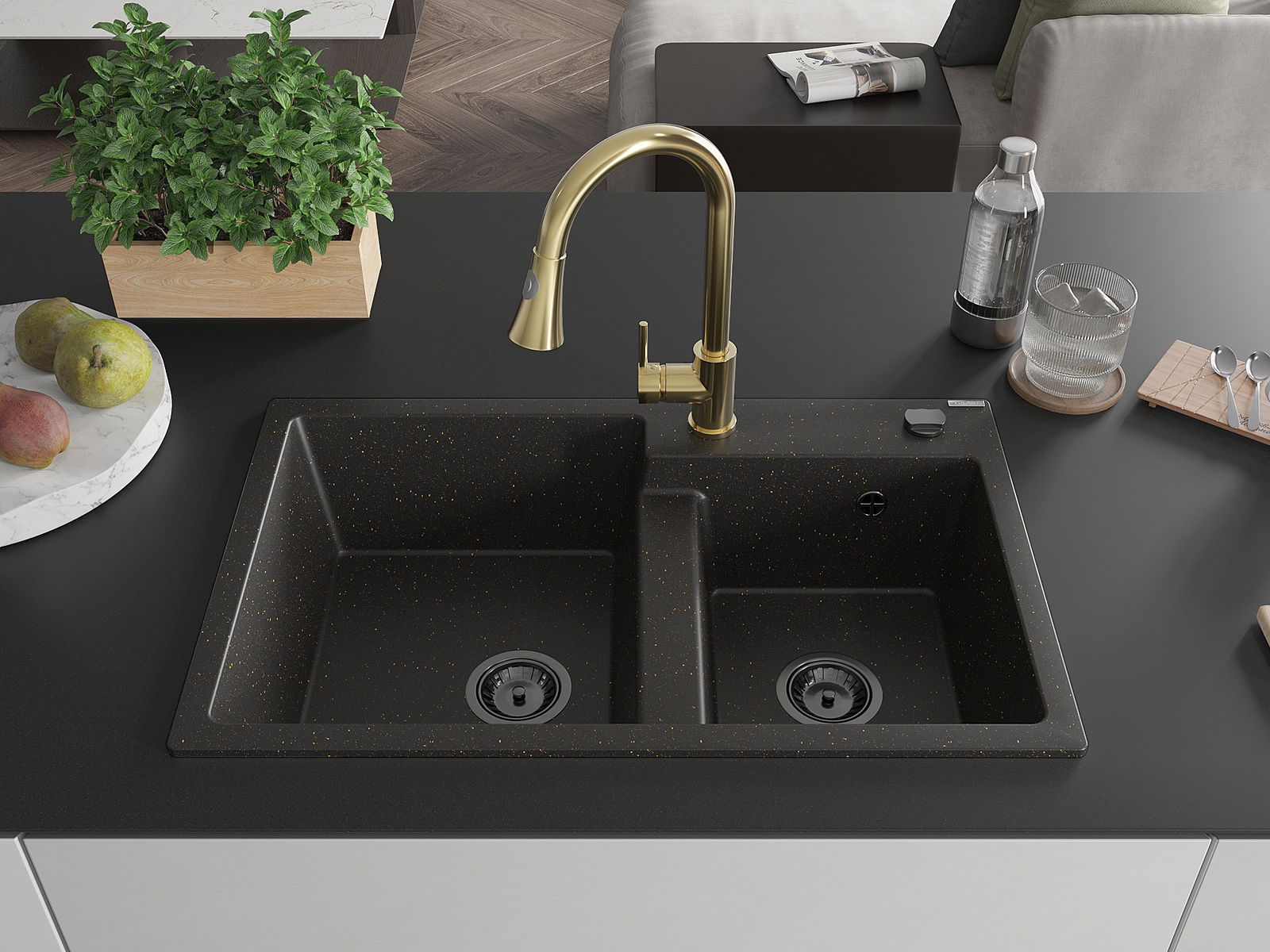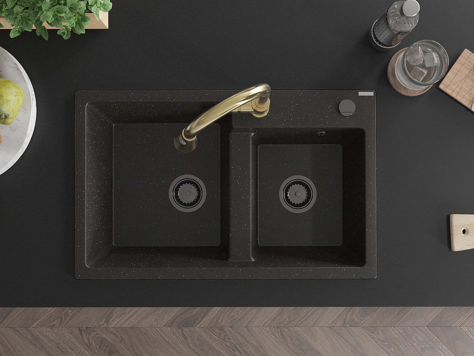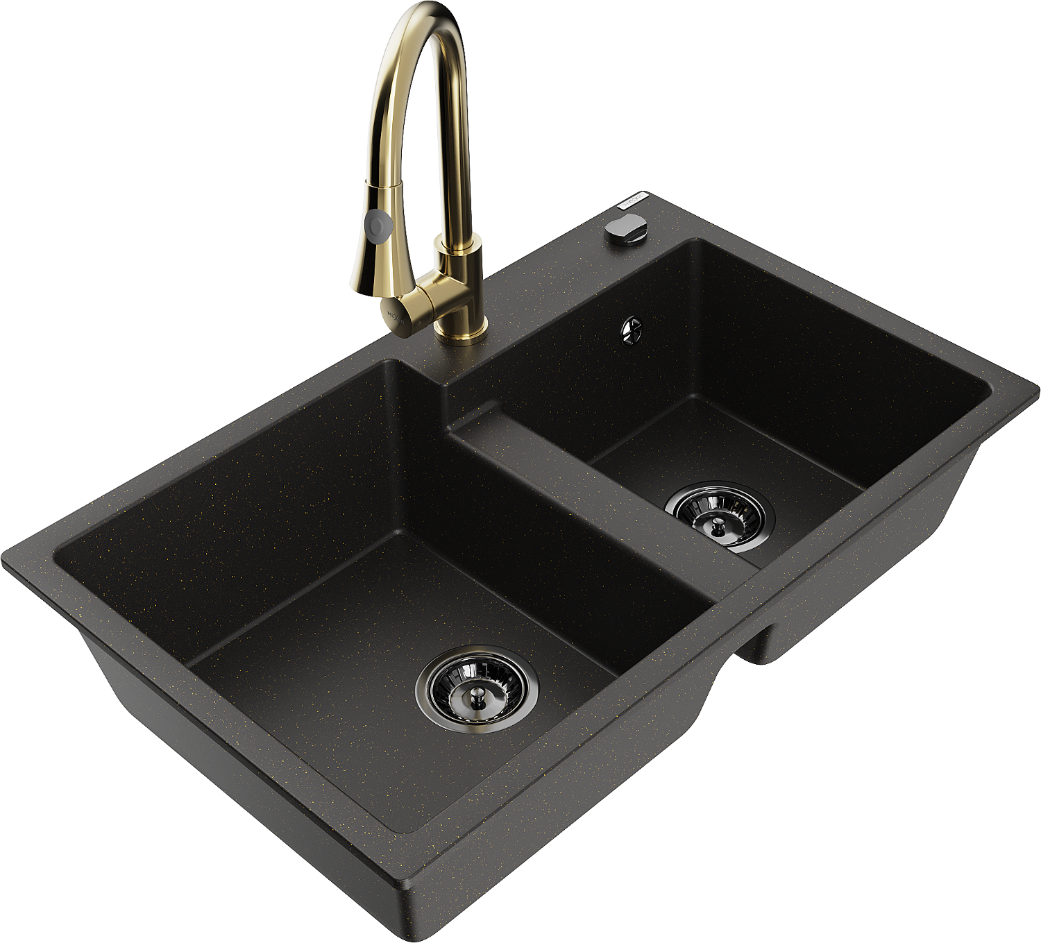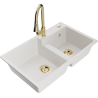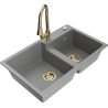 Mexen Tomas granieten spoelbak met 2 kamers en keukenkraan Elia, zwart/goud metallic - 6516-75-670101-50-B