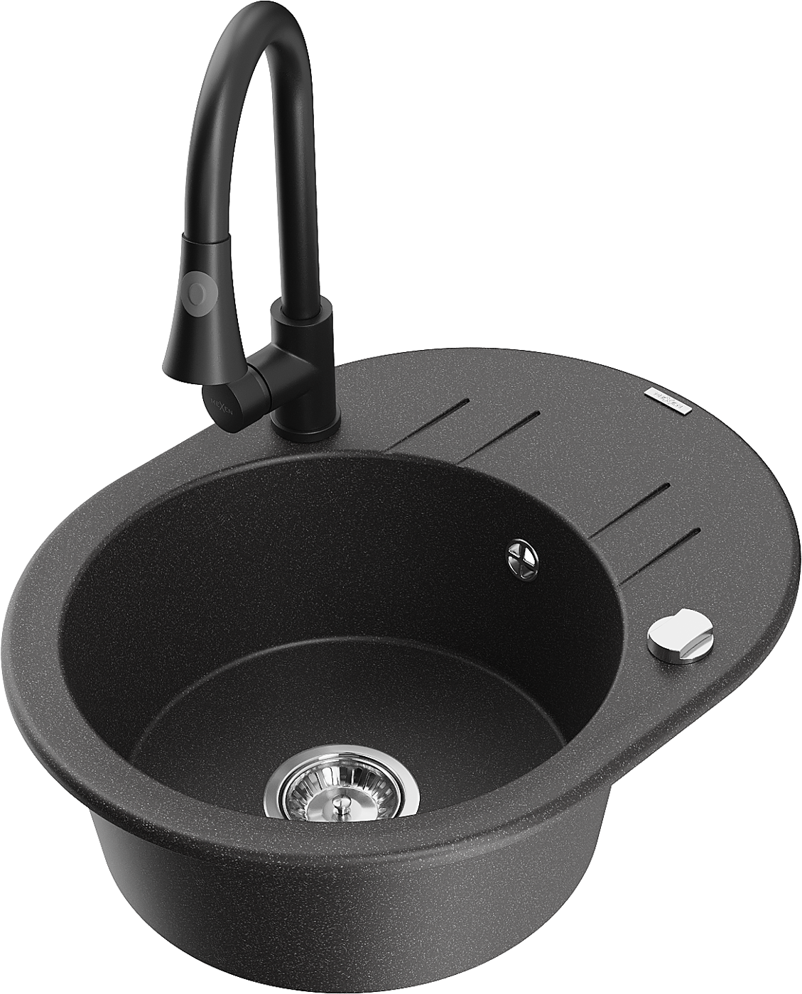 Mexen Kevin granieten spoelbak met 1 bak, afdruiprek en Elia keukenmengkraan, zwart gespikkeld - 6517-76-670101-70