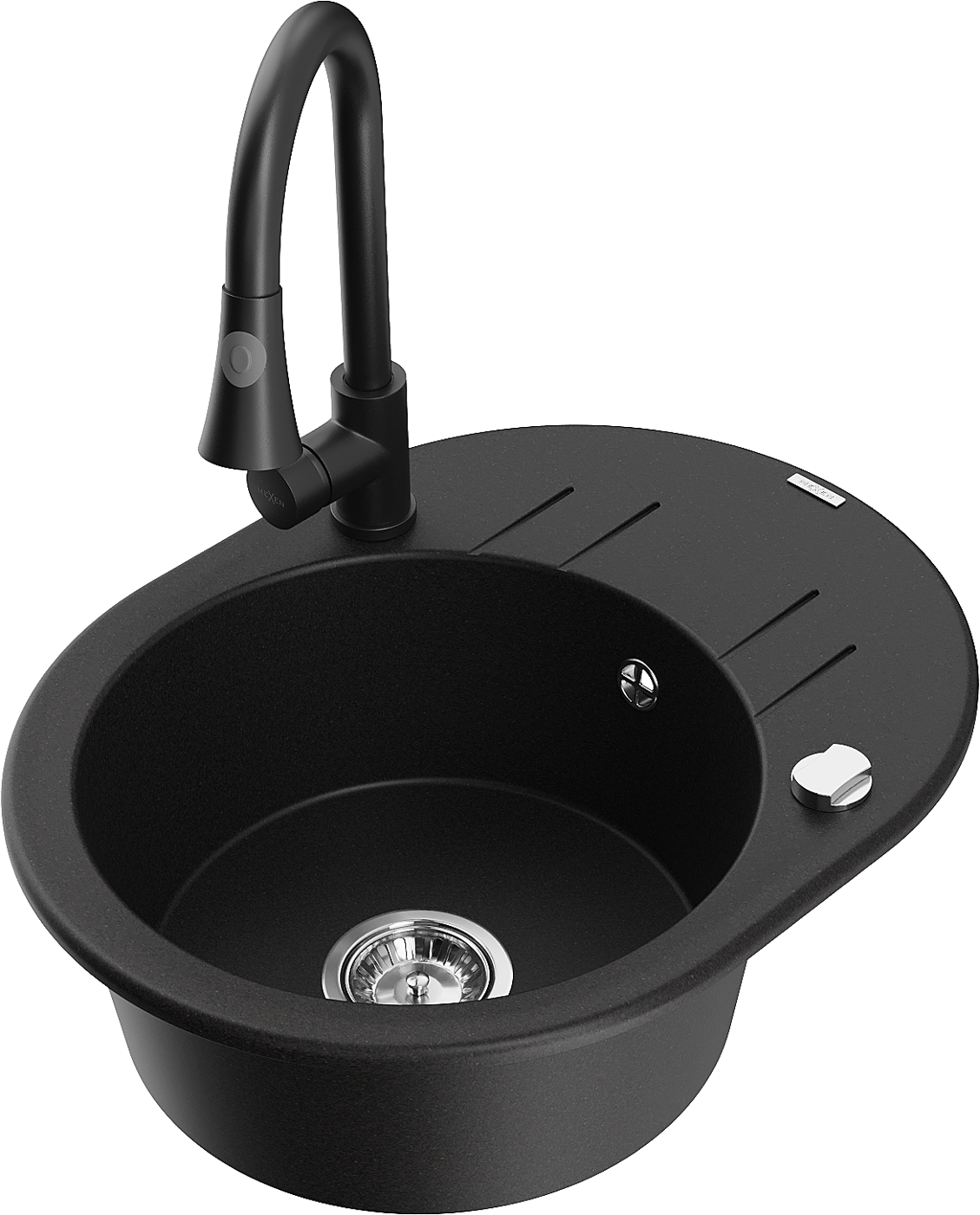 Mexen Kevin granieten spoelbak 1-compartiment met afdruiprek en keukenmengkraan Elia, zwart - 6517-77-670101-70