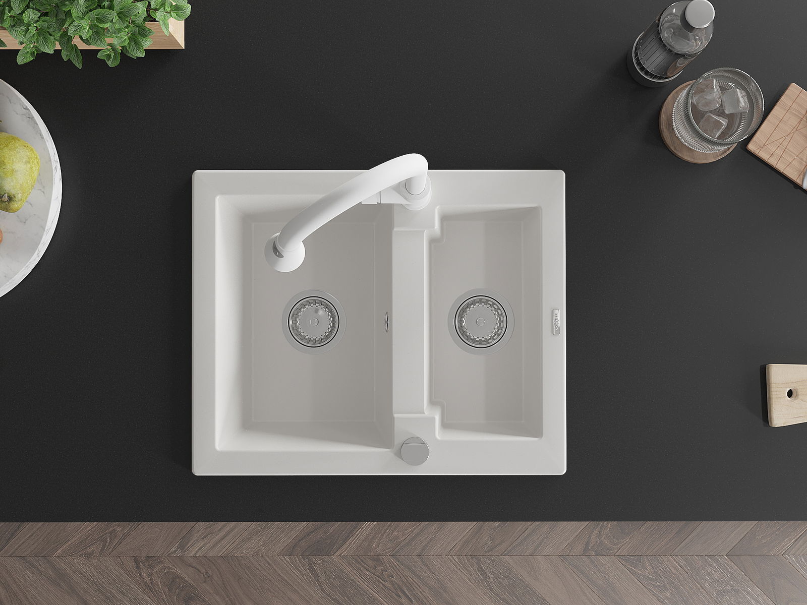 Mexen Carlos granieten gootsteen 1,5-komor met keukenmengkraan Elia, wit - 6518-20-670101-20
