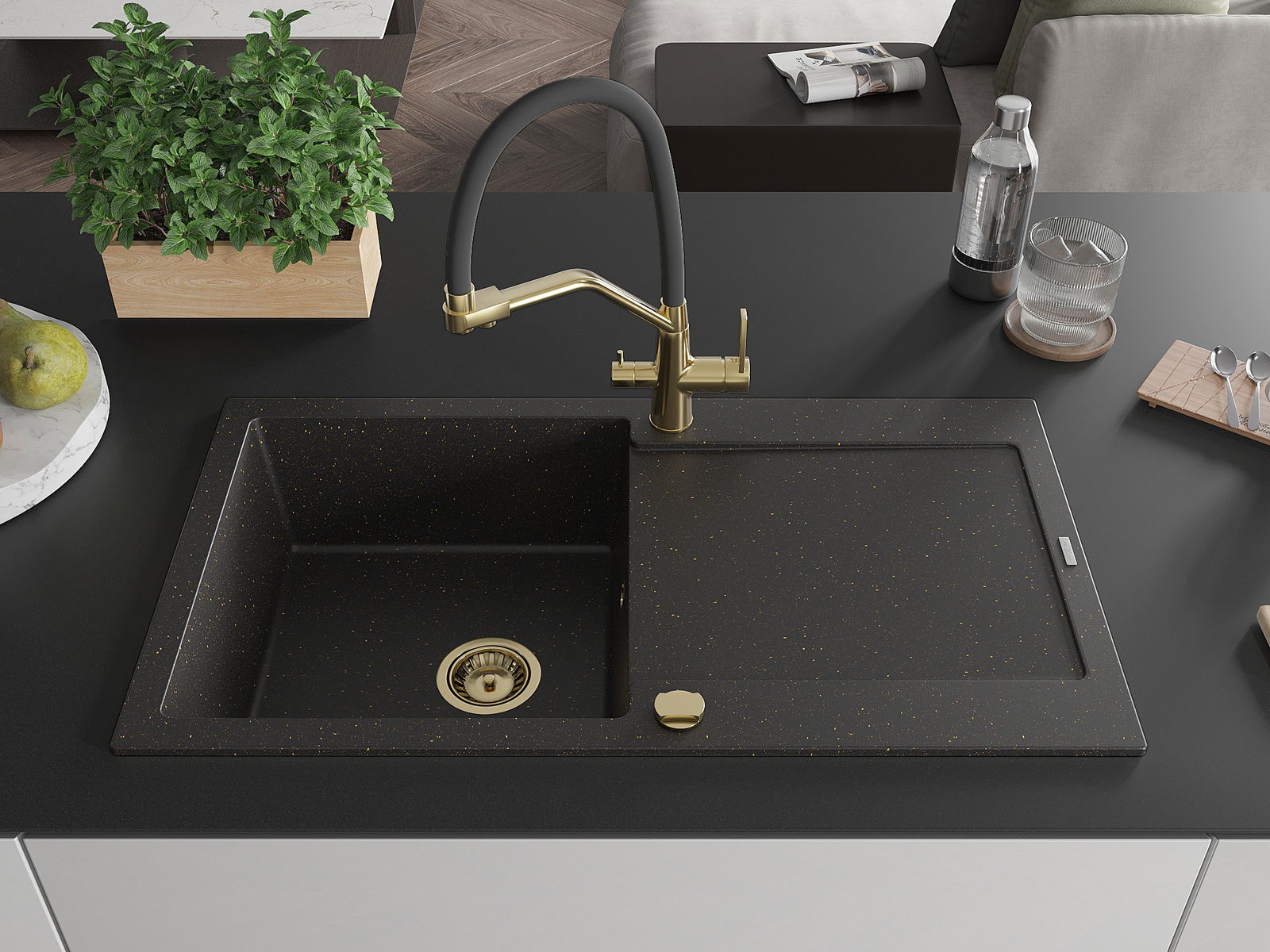 Mexen Leo granieten spoelbak met 1 kamer, afdruiprek en Duo-keukenkraan, zwart/gouden metallic - 6501-75-671701-57-G
