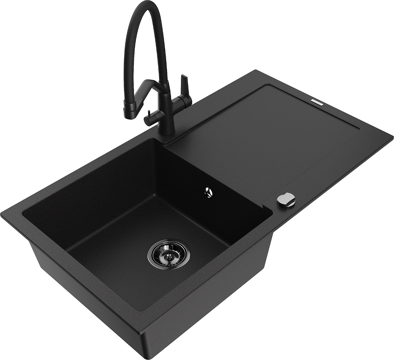 Mexen Leo granieten gootsteen met 1 bak, afdruiprek en keukenmengkraan Duo, zwart - 6501-77-671701-70-B