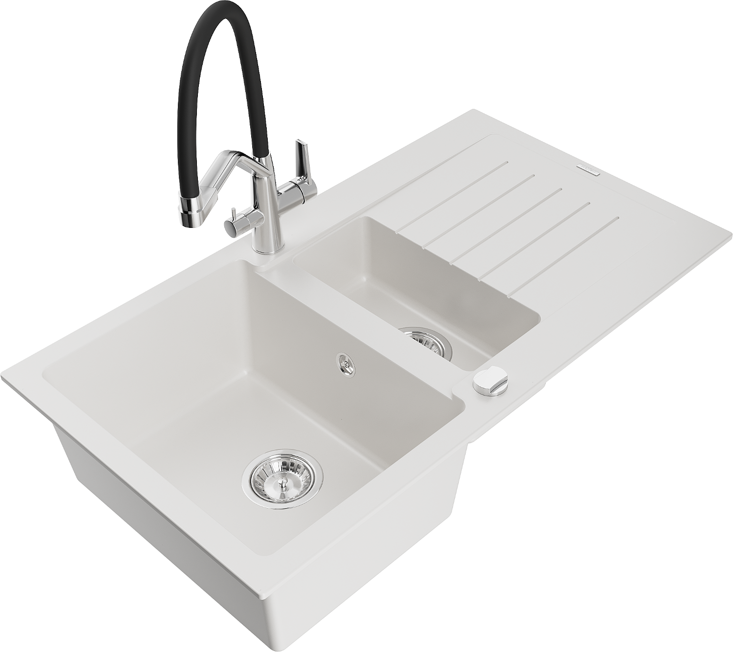 Mexen Matias granieten spoelbak 1,5-komor met afdruiprek en Duo keukenmengkraan, wit - 6502-20-671701-07