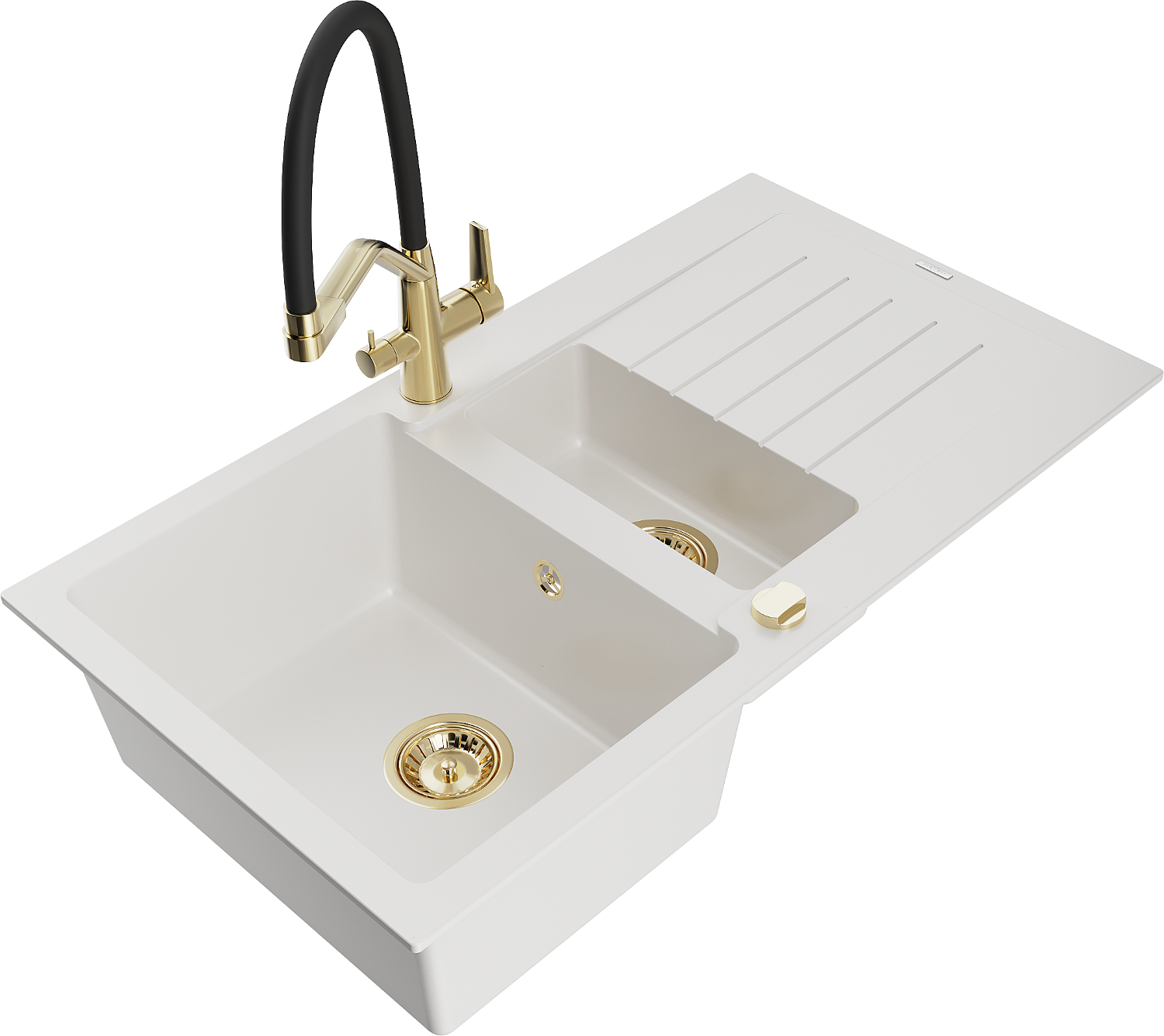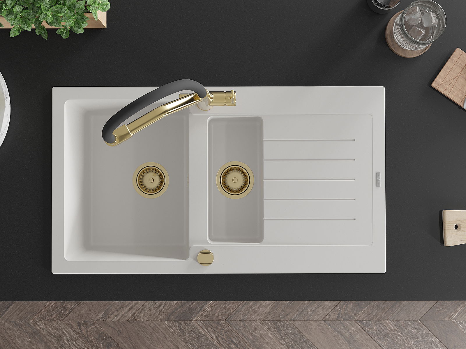 Mexen Matias granieten spoelbak 1,5-kamer met afdruiprek en Duo keukenkraan, wit - 6502-20-671701-57-G