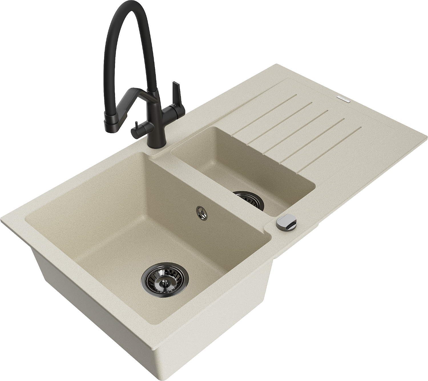 Mexen Matias granieten spoelbak 1,5-komerig met afdruiprek en Duo keukenmengkraan, beige - 6502-69-671701-70-B