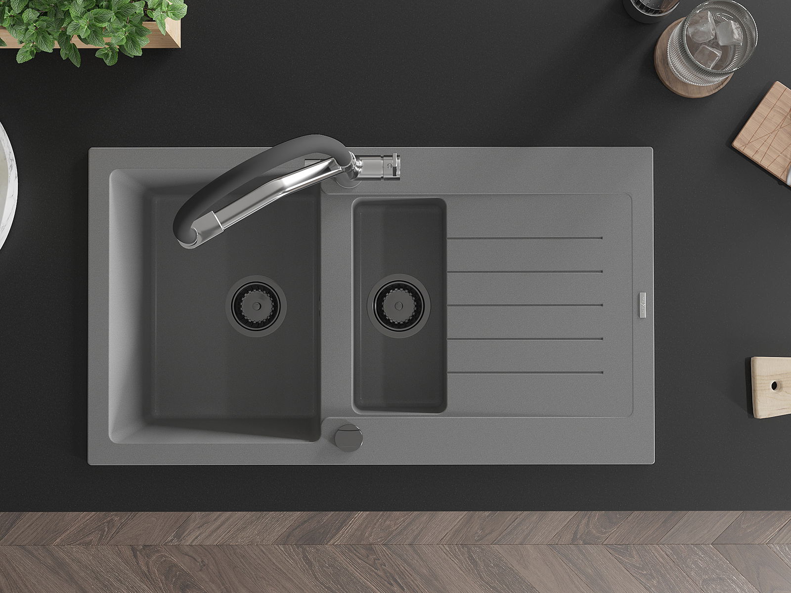 Mexen Matias granieten spoelbak 1,5-compartiment met afdruiprek en keukenmengkraan Duo, grijs - 6502-71-671701-07-B