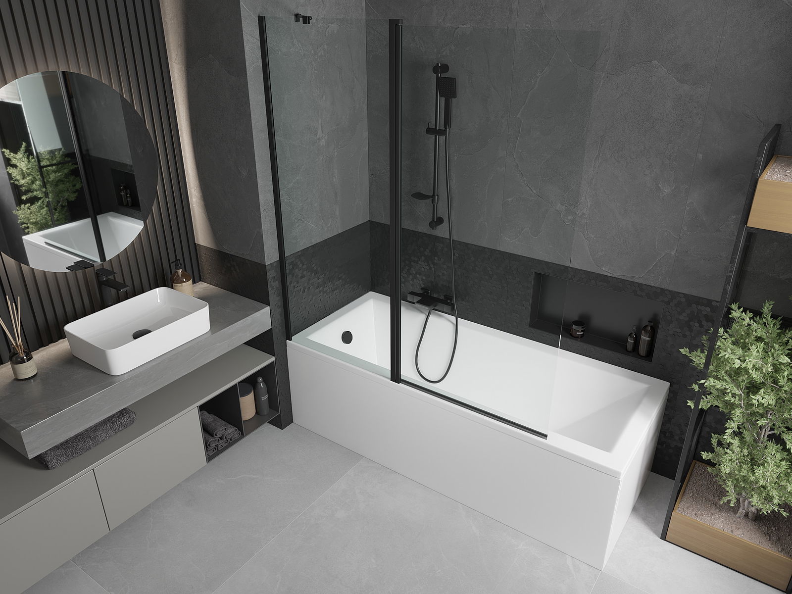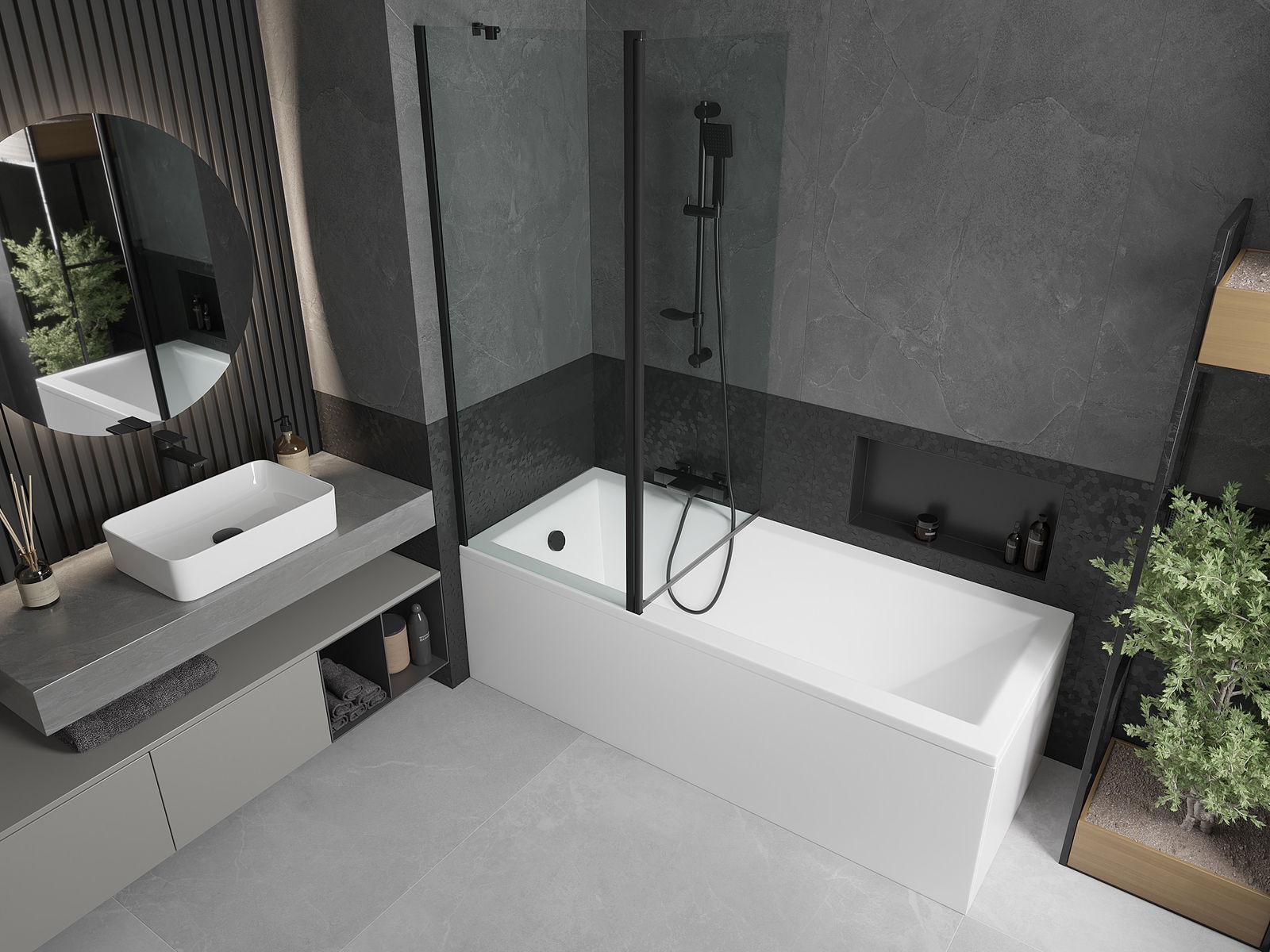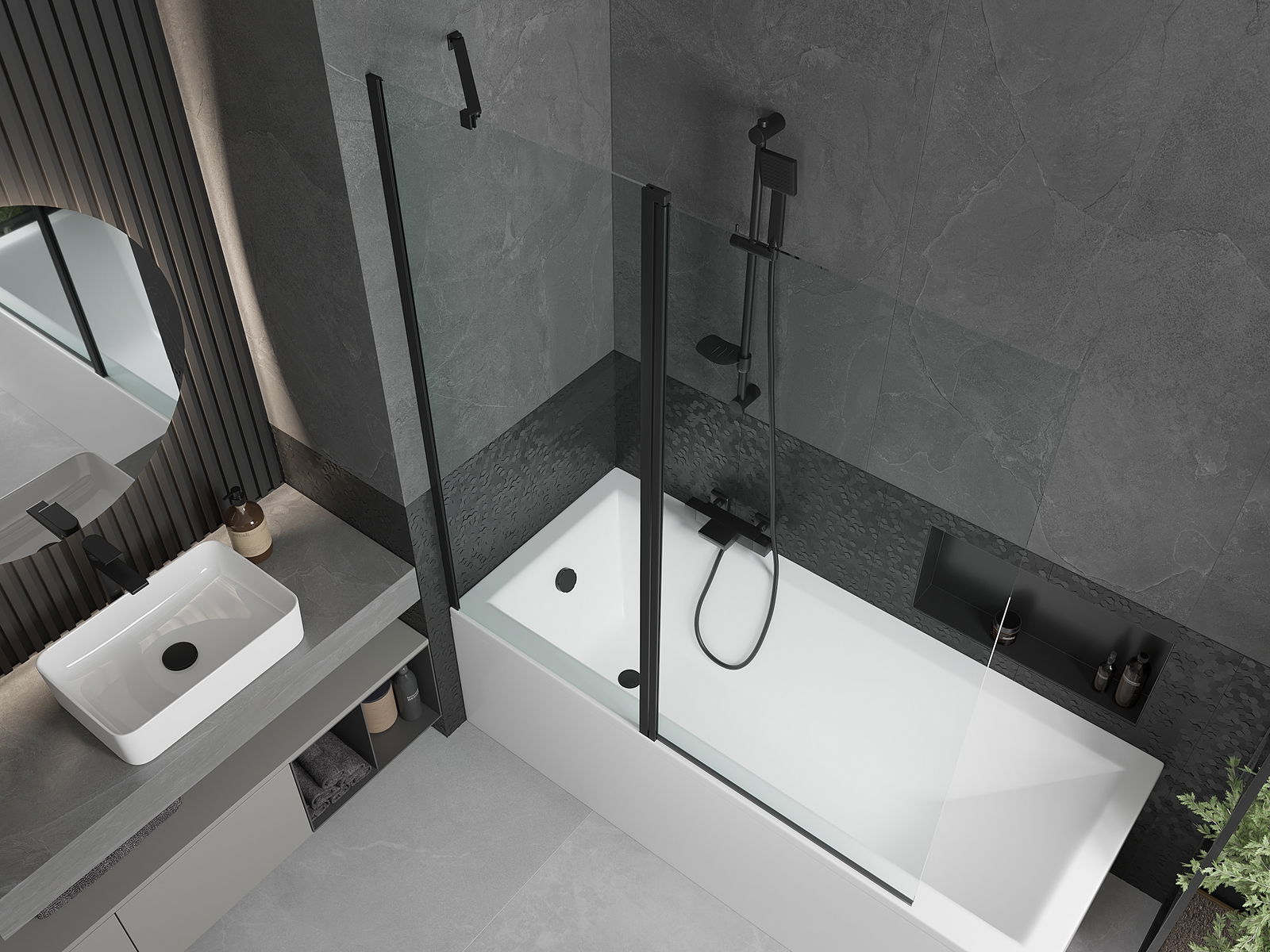 Het scherm heeft één beweegbare vleugel die kan worden opgevouwen. Deze oplossing bespaart ruimte in de badkamer en zorgt ervoor dat u de resterende ruimte vrij kunt gebruiken wanneer de badkamer niet in gebruik is.