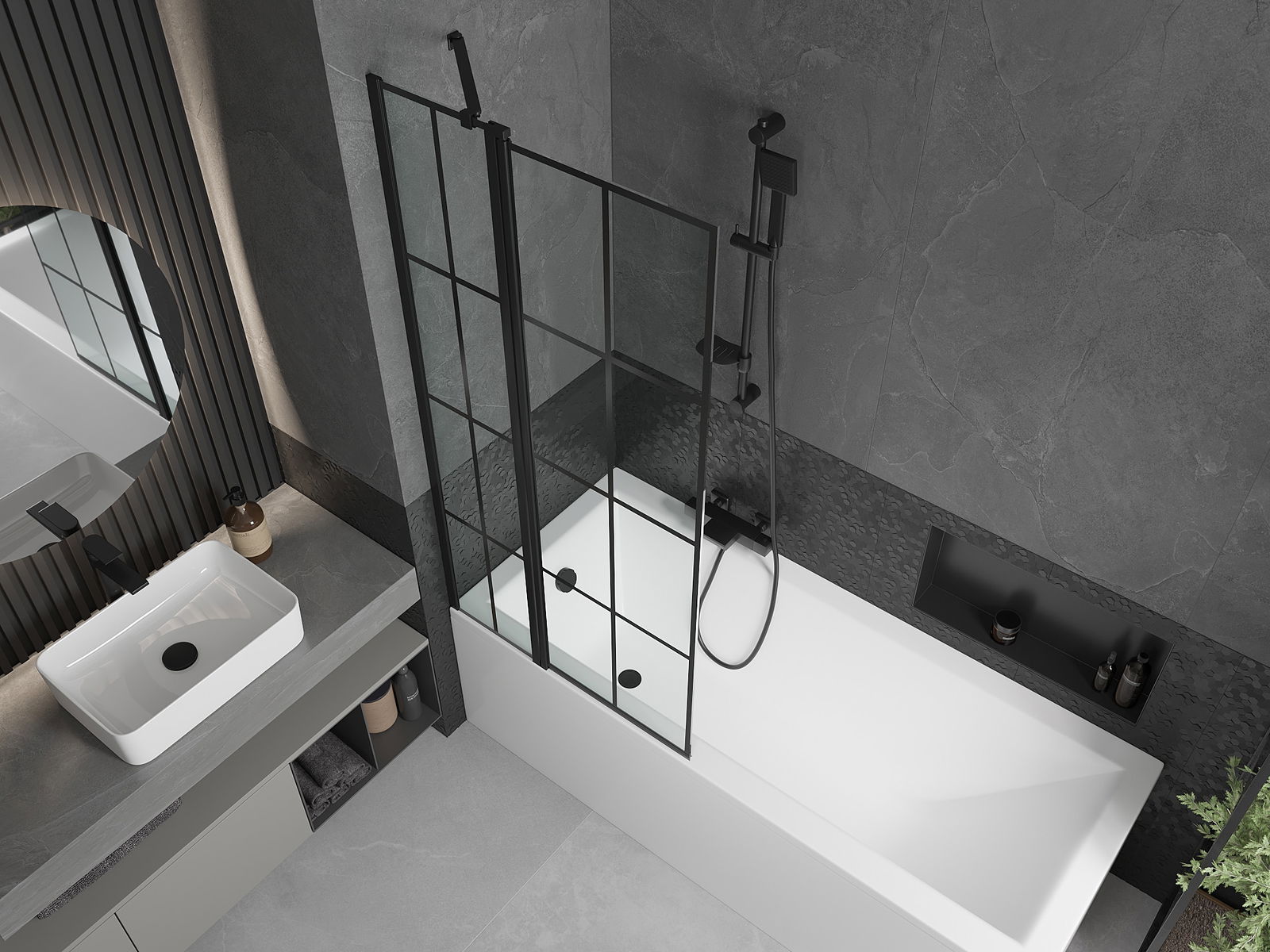 Het scherm heeft één beweegbare vleugel met de mogelijkheid om in te klappen. Deze oplossing bespaart meer ruimte in de badkamer en maakt het mogelijk om vrij gebruik te maken van de resterende ruimte wanneer we de badzone niet gebruiken.