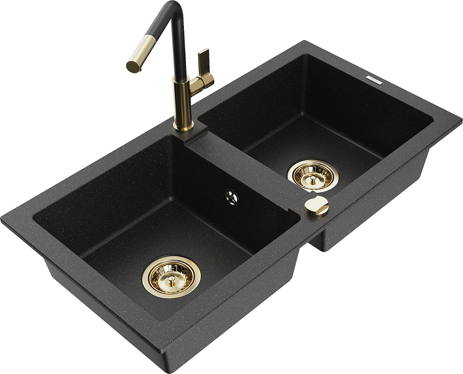 Mexen Mario granieten spoelbak met 2 kamers en Flora keukenkraan, zwart/zilver metallic - 6504-73-670401-57-G