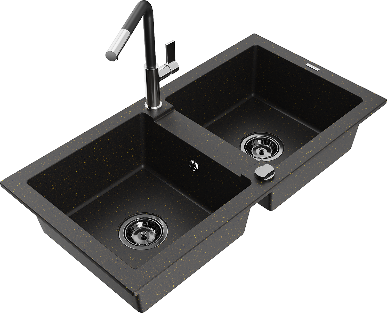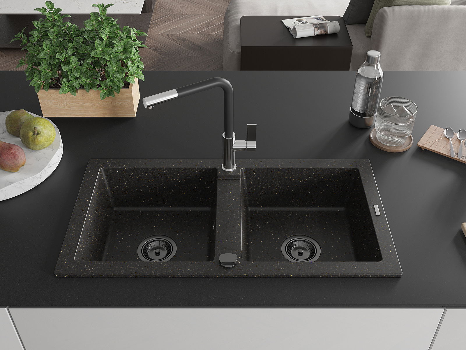 Mexen Mario granieten gootsteen 2-kamer met keukenkraan Flora, zwart/goud metallic - 6504-75-670401-07-B