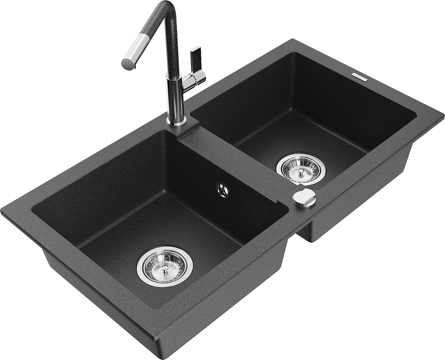 Mexen Mario granieten gootsteen 2-kamers met keukenmengkraan Flora, zwart gespikkeld - 6504-76-670401-08