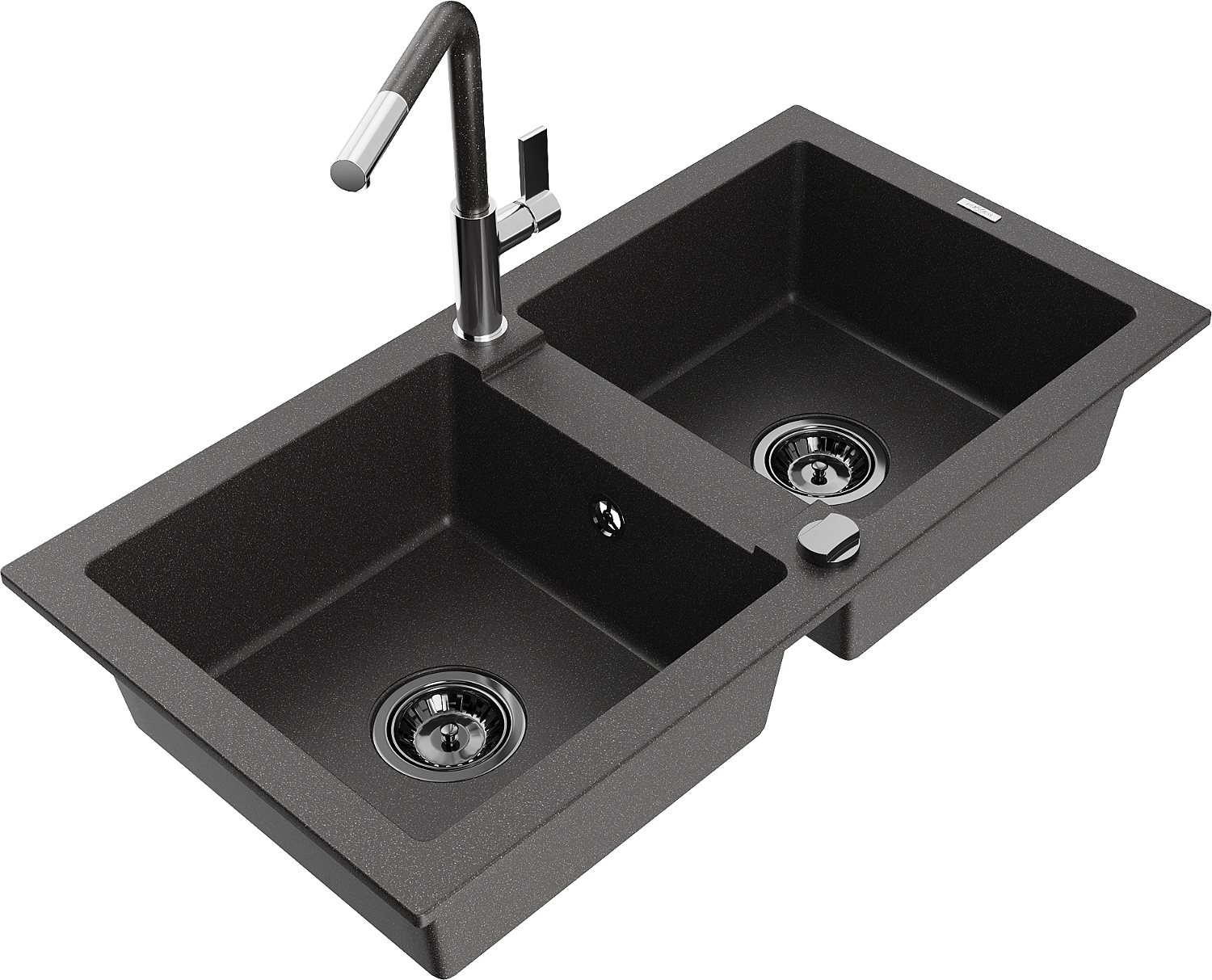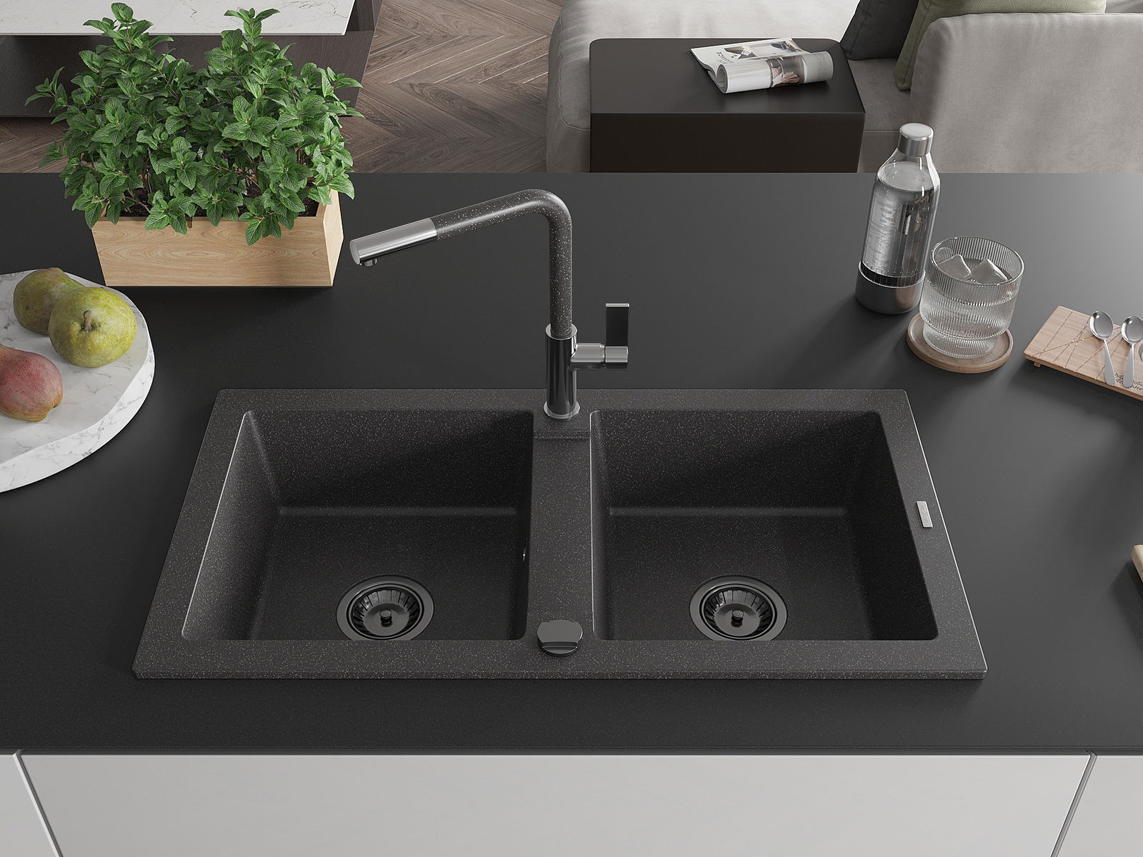 Mexen Mario granieten gootsteen 2-kamer met keukenmengkraan Flora, zwart gespikkeld - 6504-76-670401-08-B