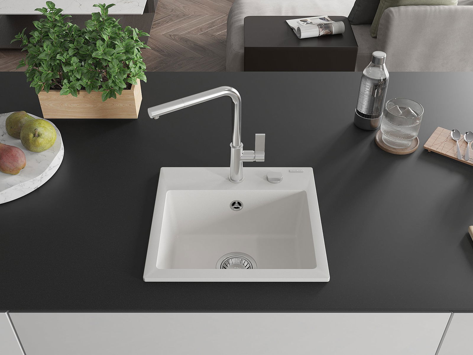 Mexen Milo granieten spoelbak 1-komor met keukenkraan Flora, wit - 6505-20-670401-00