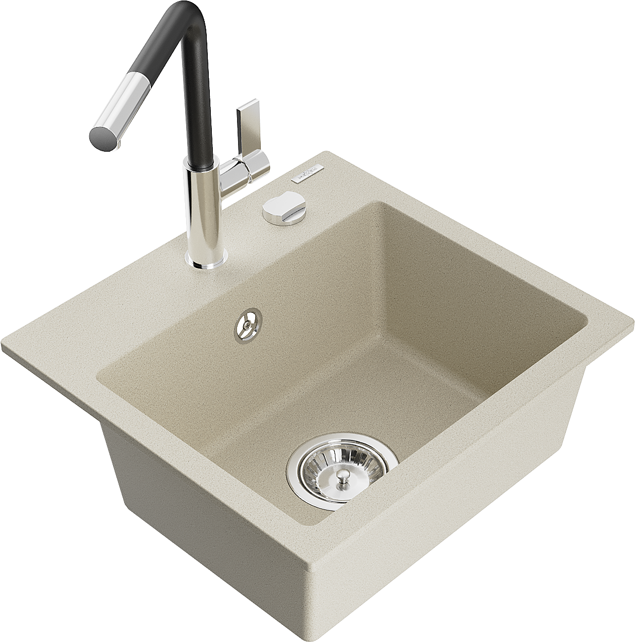 Mexen Milo granieten gootsteen met 1 kom en Flora keukenkraan, beige - 6505-69-670401-07