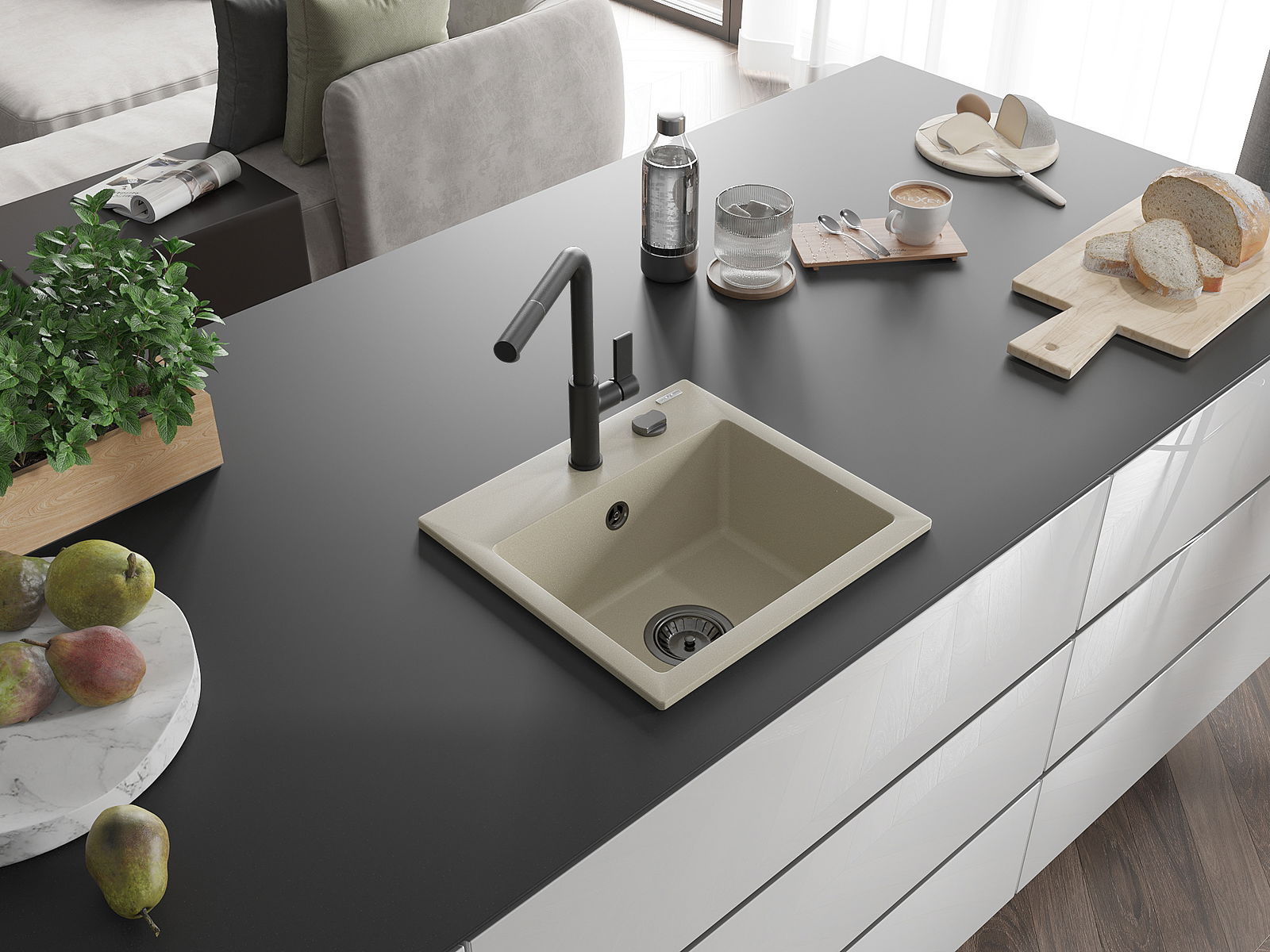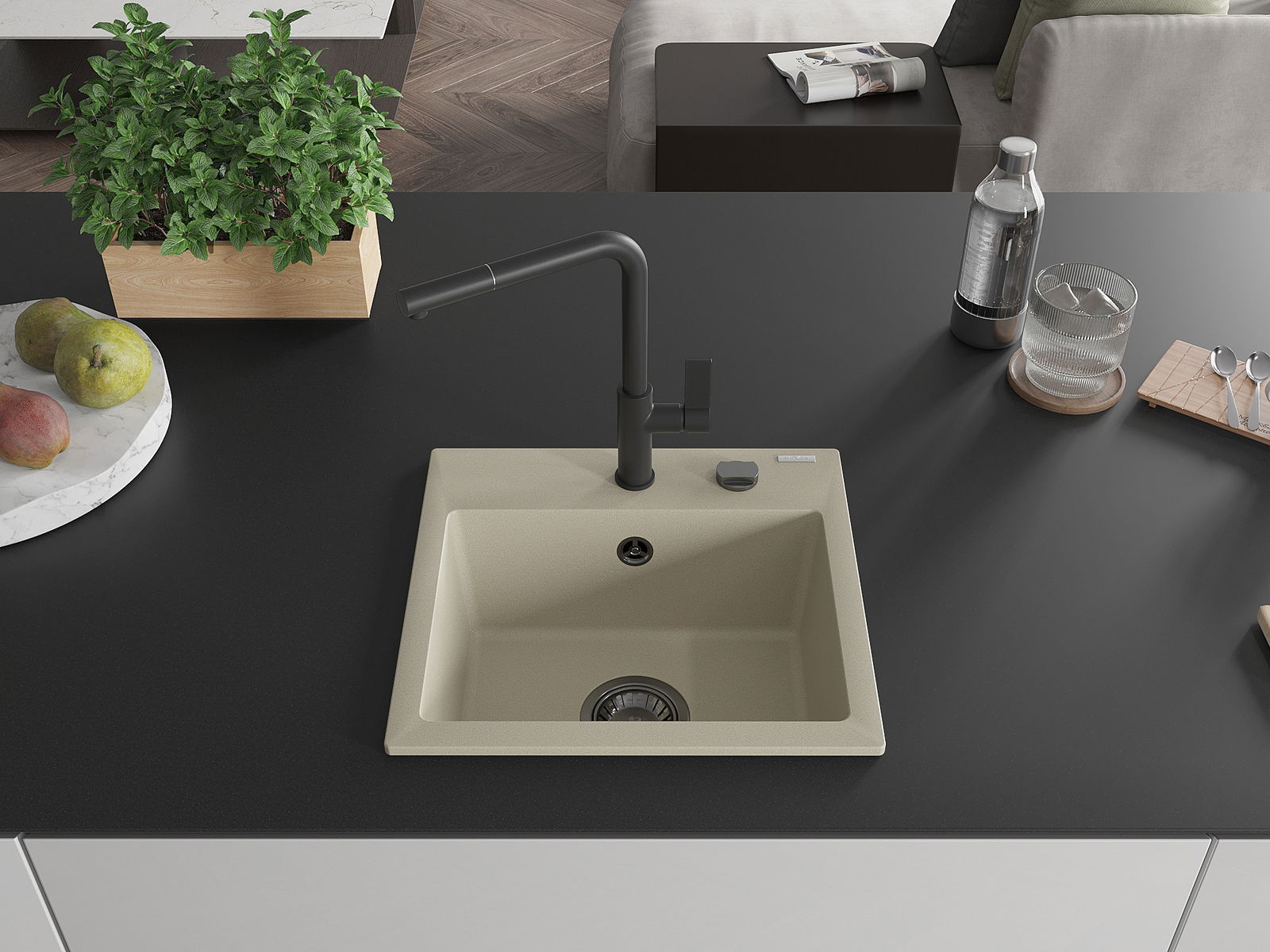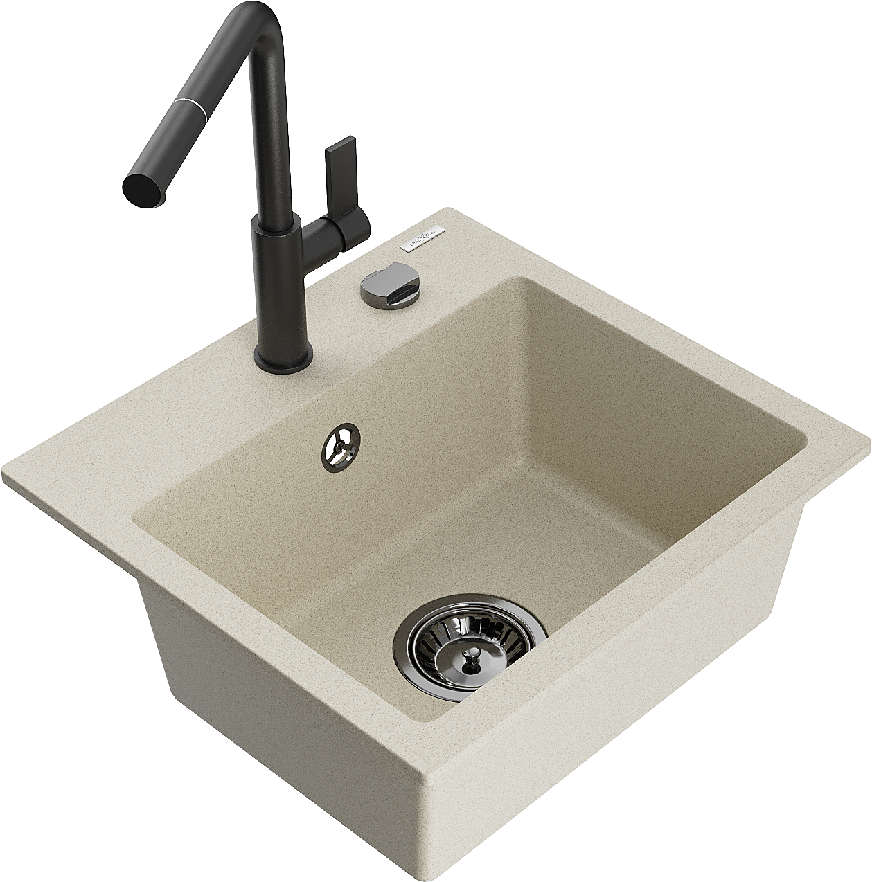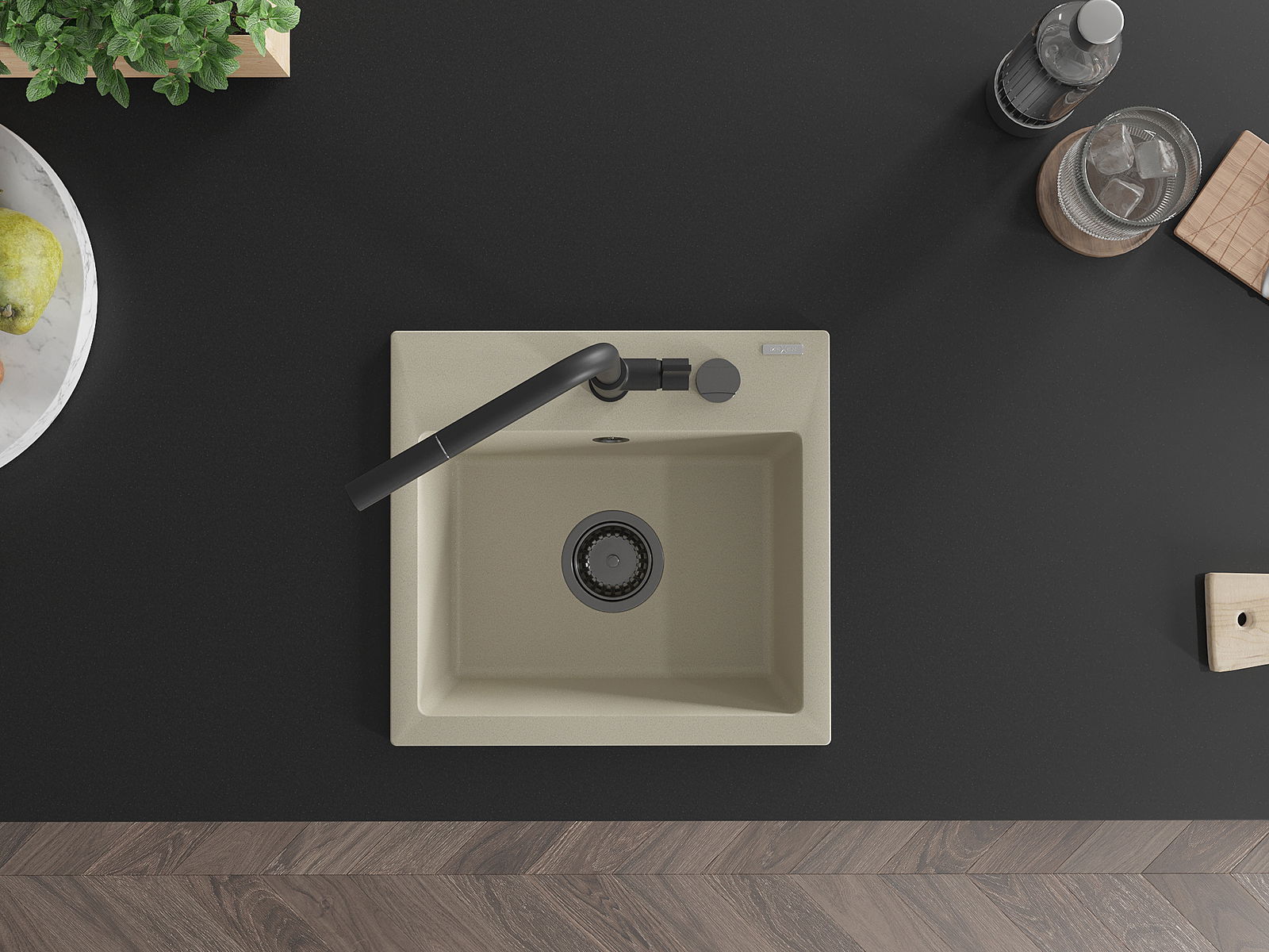 Mexen Milo granieten gootsteen 1-kompartiment met keukenmengkraan Flora, beige - 6505-69-670401-70-B