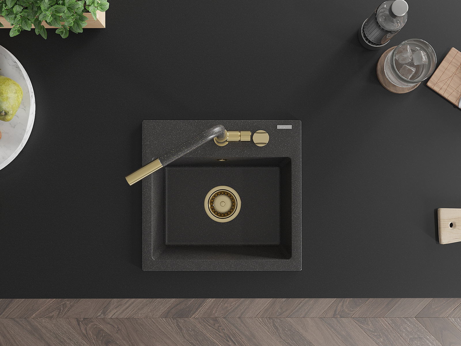 De spoelbak heeft een voorgesneden gat met een diameter van 35 mm voor eenvoudige verwijdering. Dit gat kan bijvoorbeeld worden gebruikt om een vloeistofdispenser te installeren, waardoor plastic flessen in de keuken overbodig zijn en een elegante afwerking ontstaat.