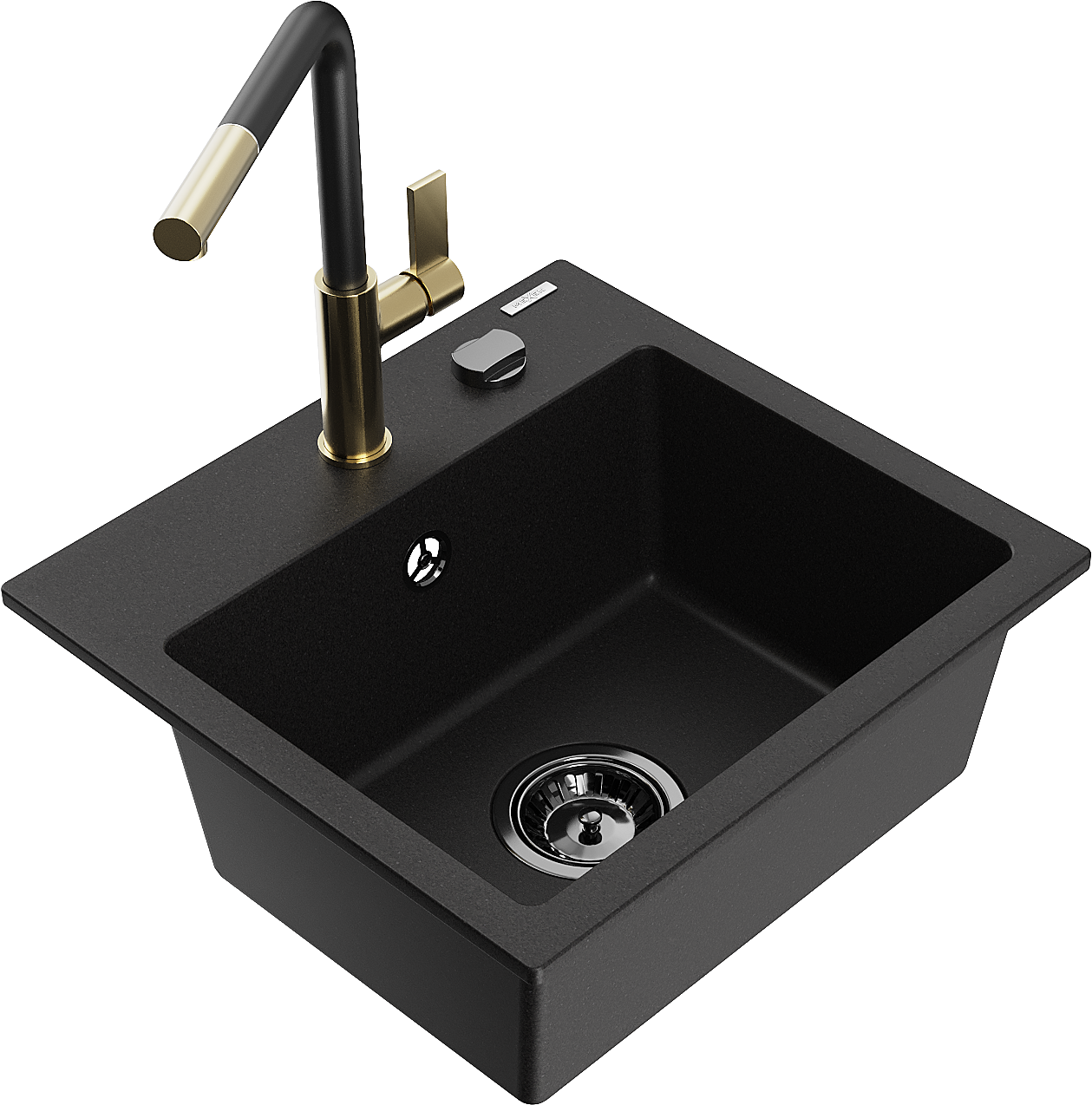 Mexen Milo granieten gootsteen met 1 kom en Flora keukenkraan, zwart - 6505-77-670401-57-B
