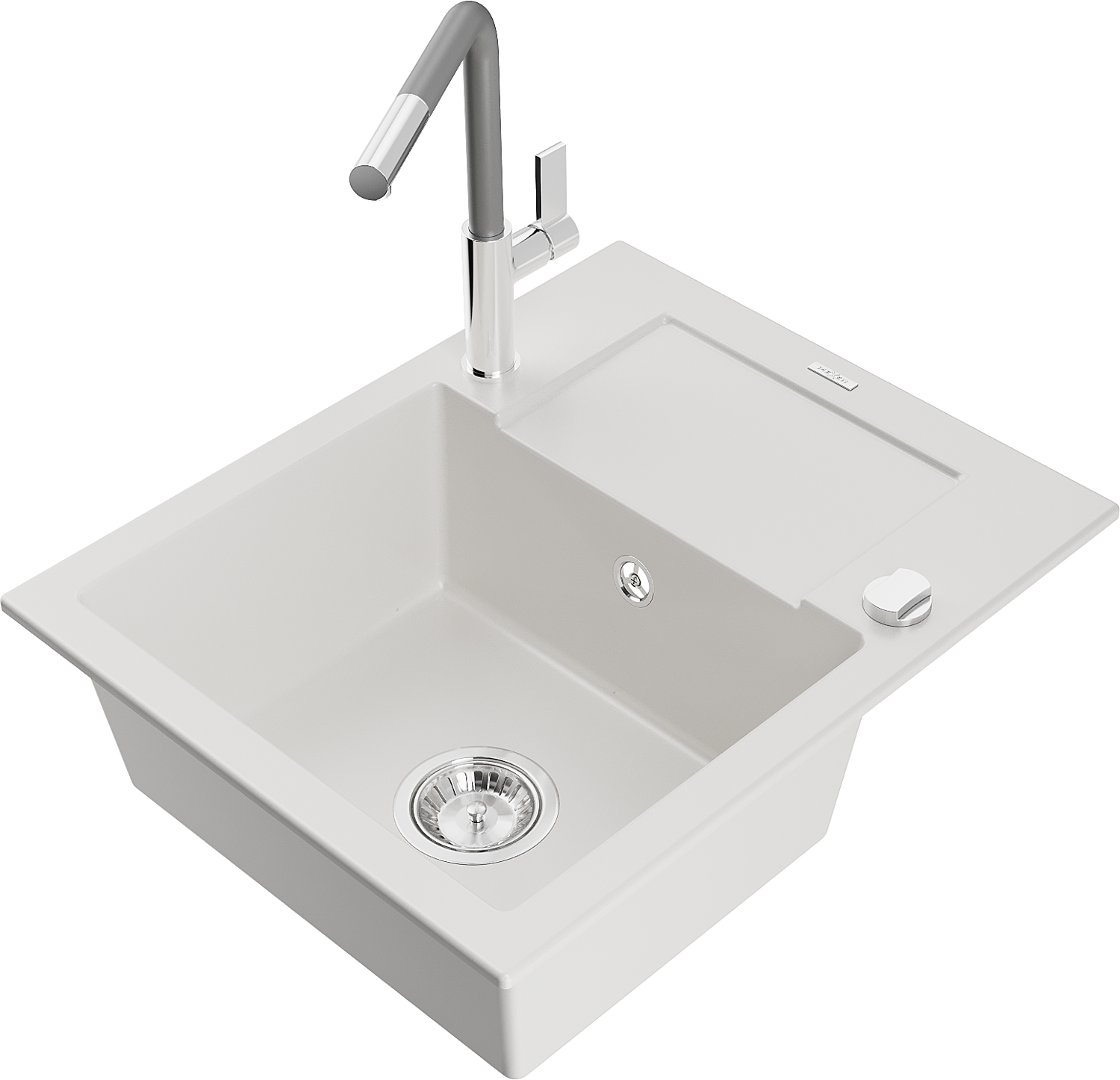 Mexen Enzo granieten spoelbak met 1 kom en afdruiprek en Flora keukenmengkraan, wit - 6506-20-670401-06