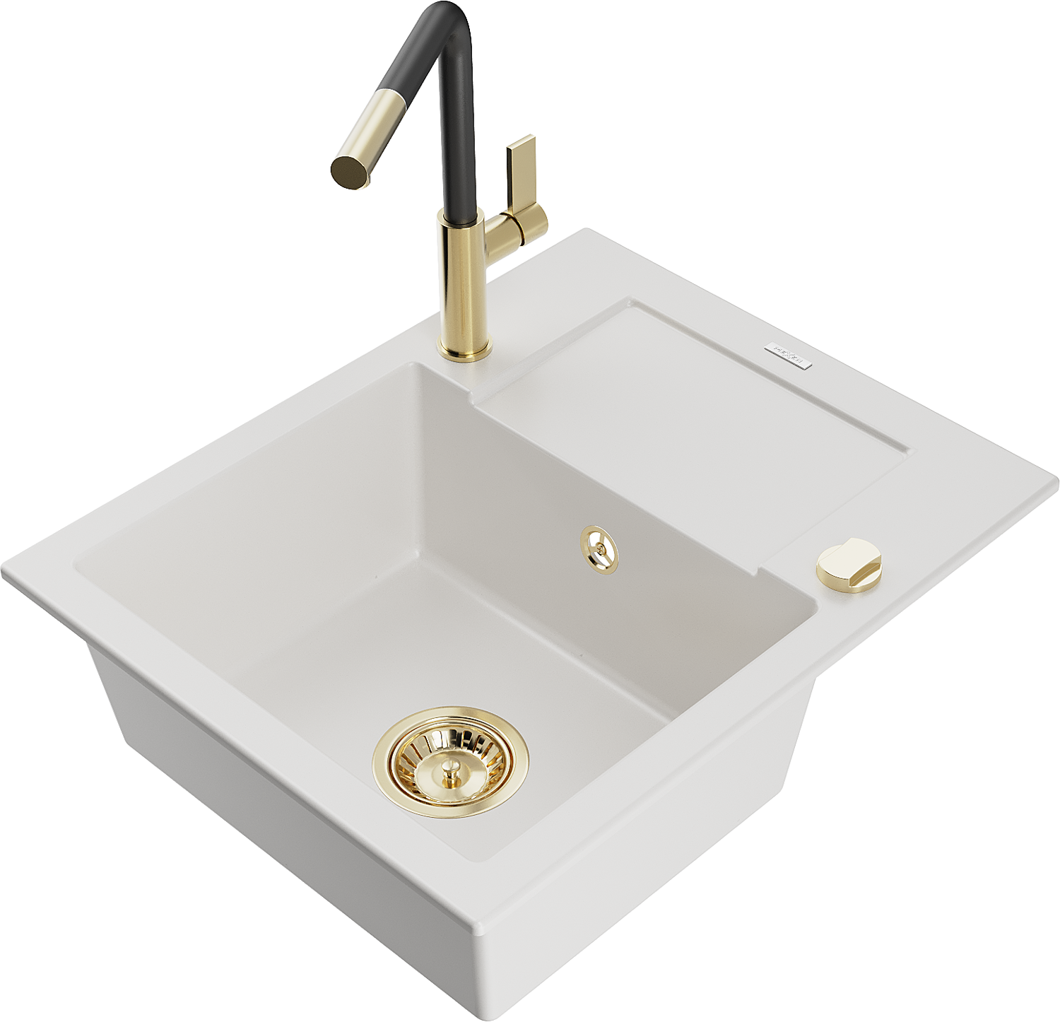 Mexen Enzo granieten spoelbak 1-komorige met druiprek en keukenmengkraan Flora, wit - 6506-20-670401-57-G