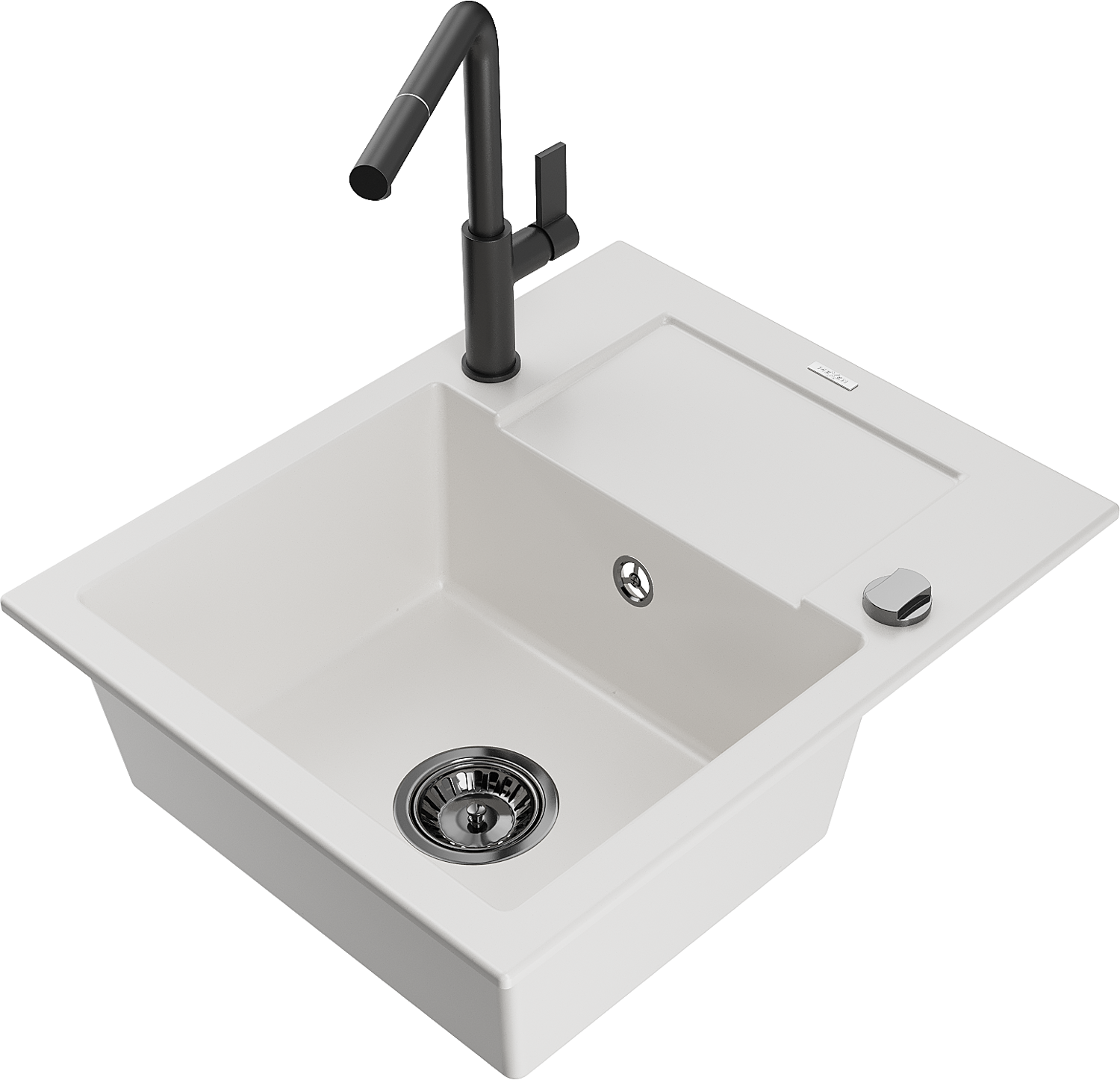 Mexen Enzo granieten gootsteen 1-bak met afdruiprek en keukenmengkraan Flora, wit - 6506-20-670401-70-B
