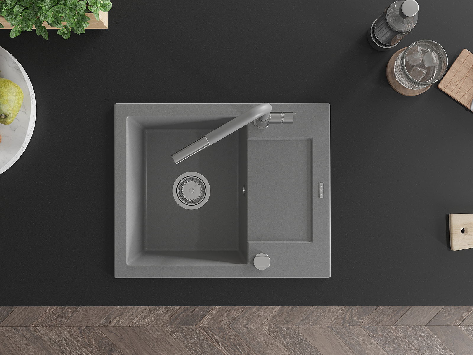 Mexen Enzo granieten spoelbak 1-komers met afdruiprek en keukenmengkraan Flora, grijs - 6506-71-670401-06