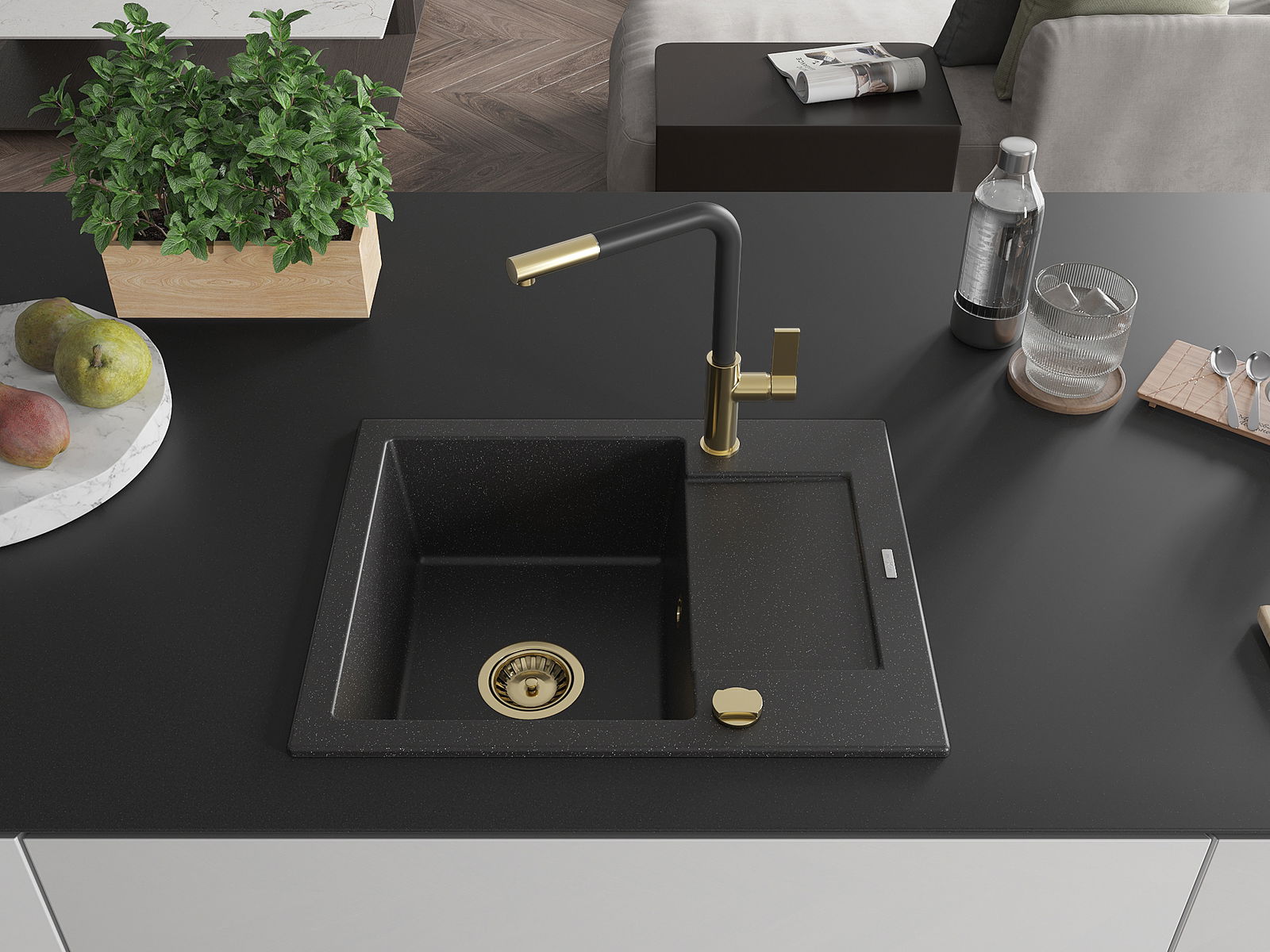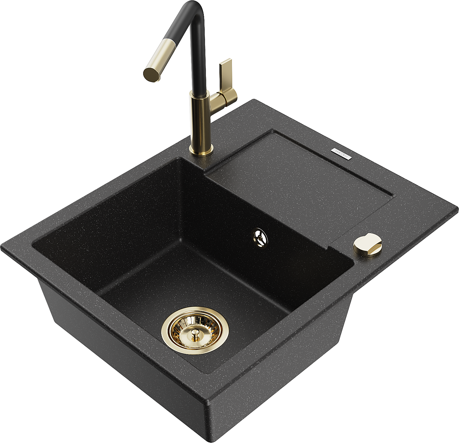 Mexen Enzo granieten spoelbak met 1 bak, afdruiprek en keukenkraan Flora, zwart/zilver metallic - 6506-73-670401-57-G