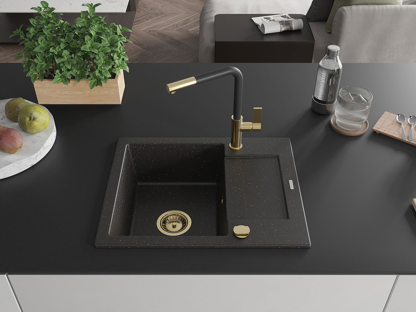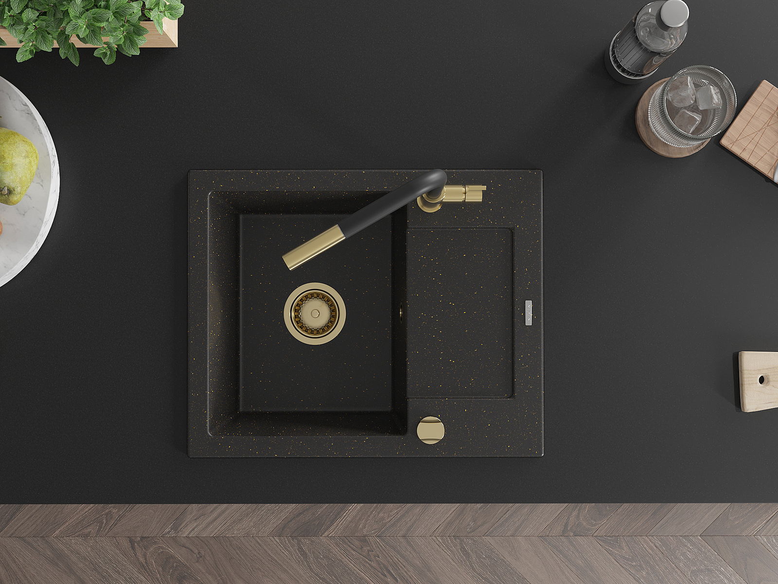 Mexen Enzo granieten gootsteen 1-compartiment met afdruiprek en keukenkraan Flora, zwart/gouden metallic - 6506-75-670401-57-G
