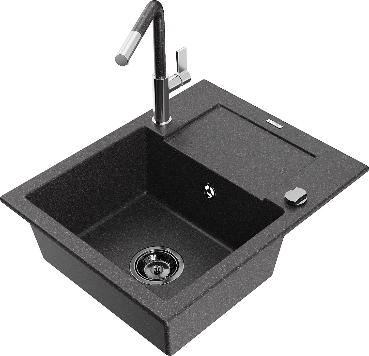Mexen Enzo granieten gootsteen 1-kamer met afdruiprek en keukenmengkraan Flora, zwart gespikkeld - 6506-76-670401-08-B