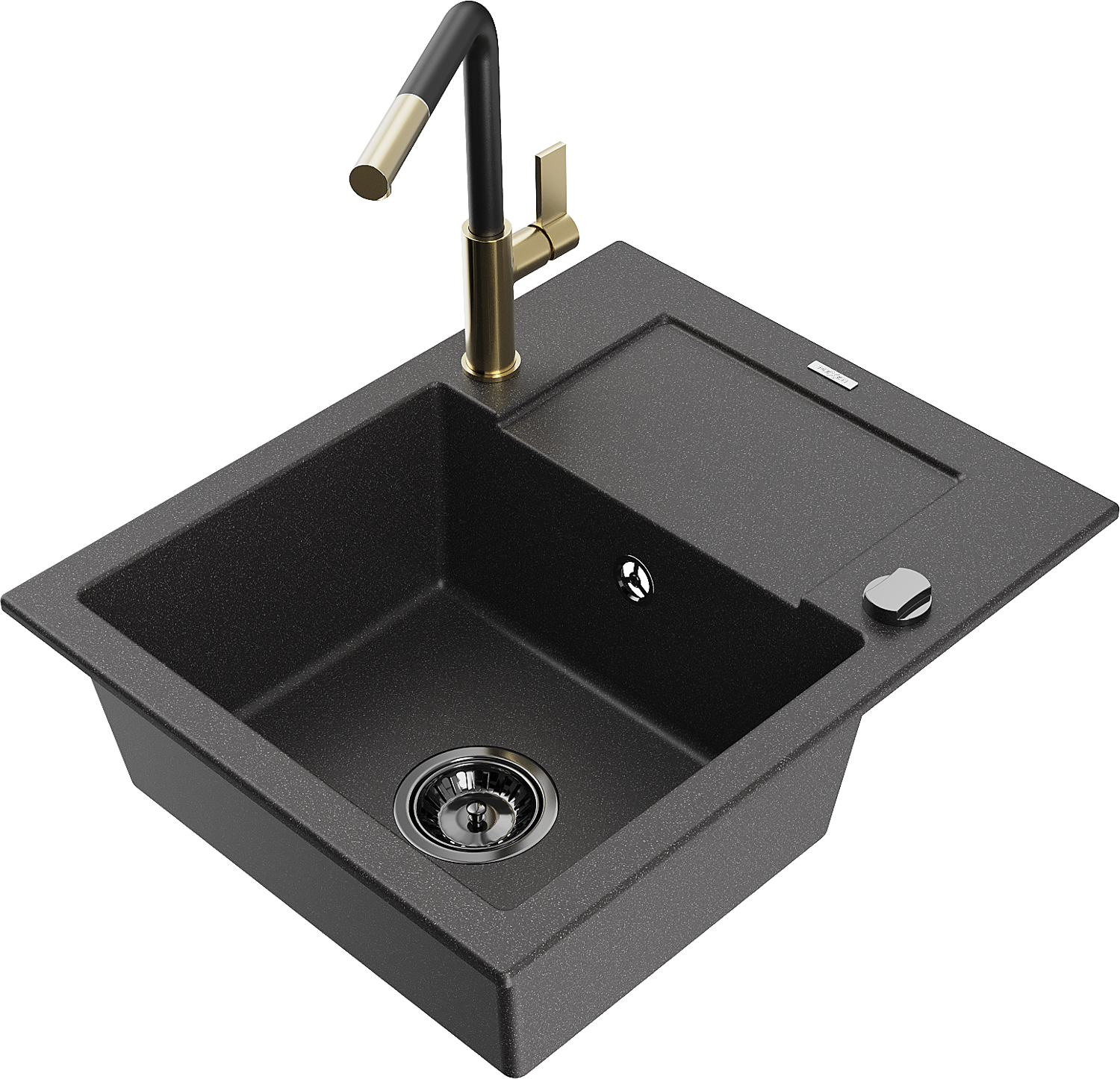 Mexen Enzo granieten spoelbak met 1 bak en druiprek en keukenmengkraan Flora, zwart gespikkeld - 6506-76-670401-57-B