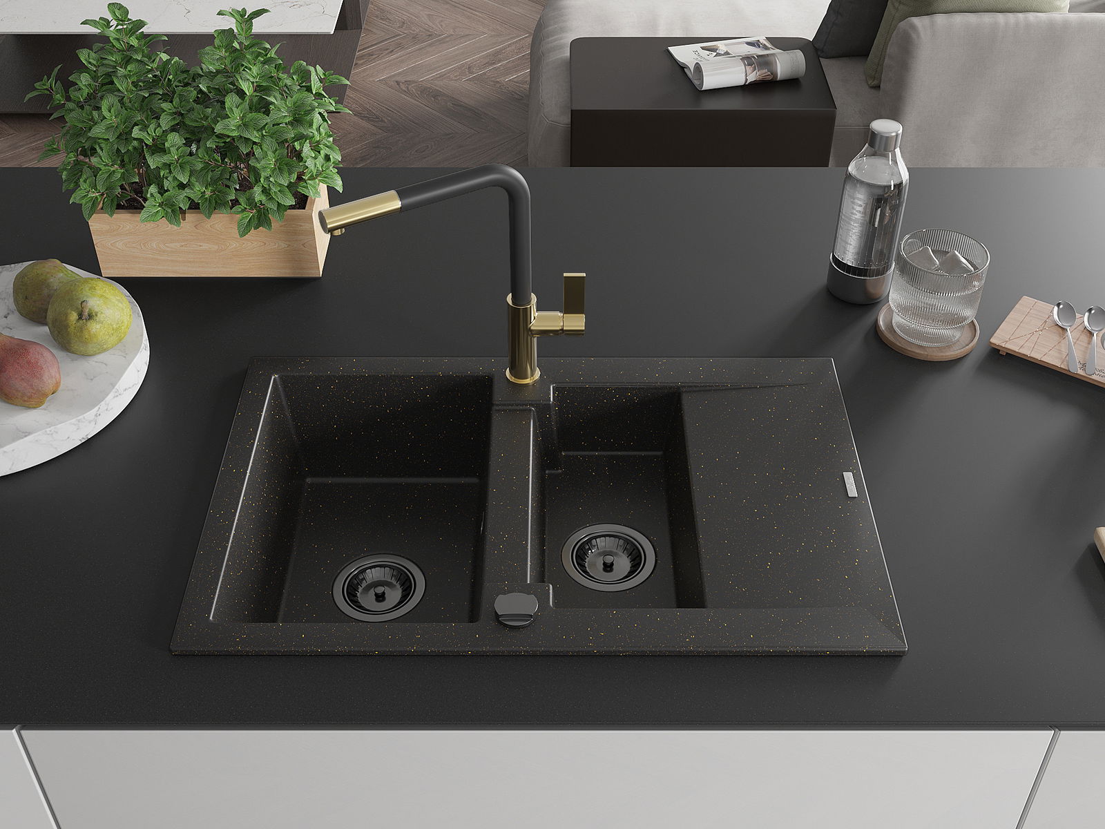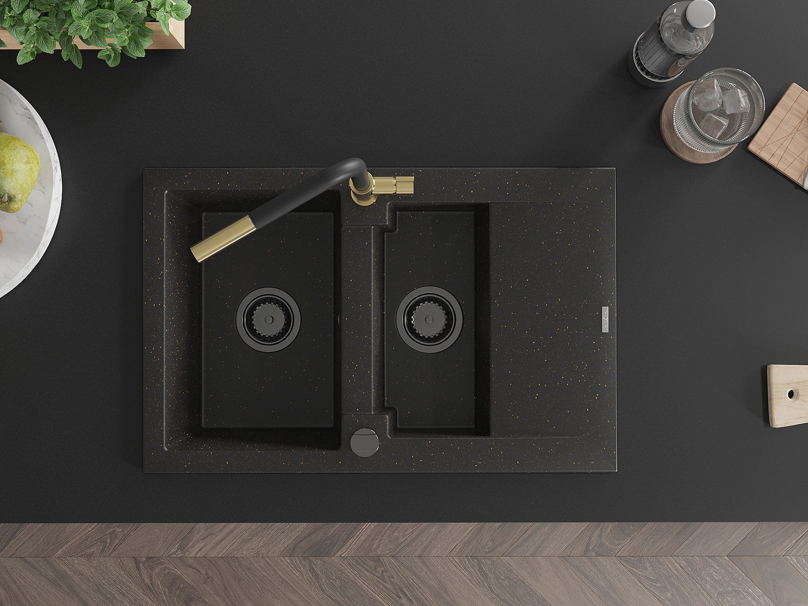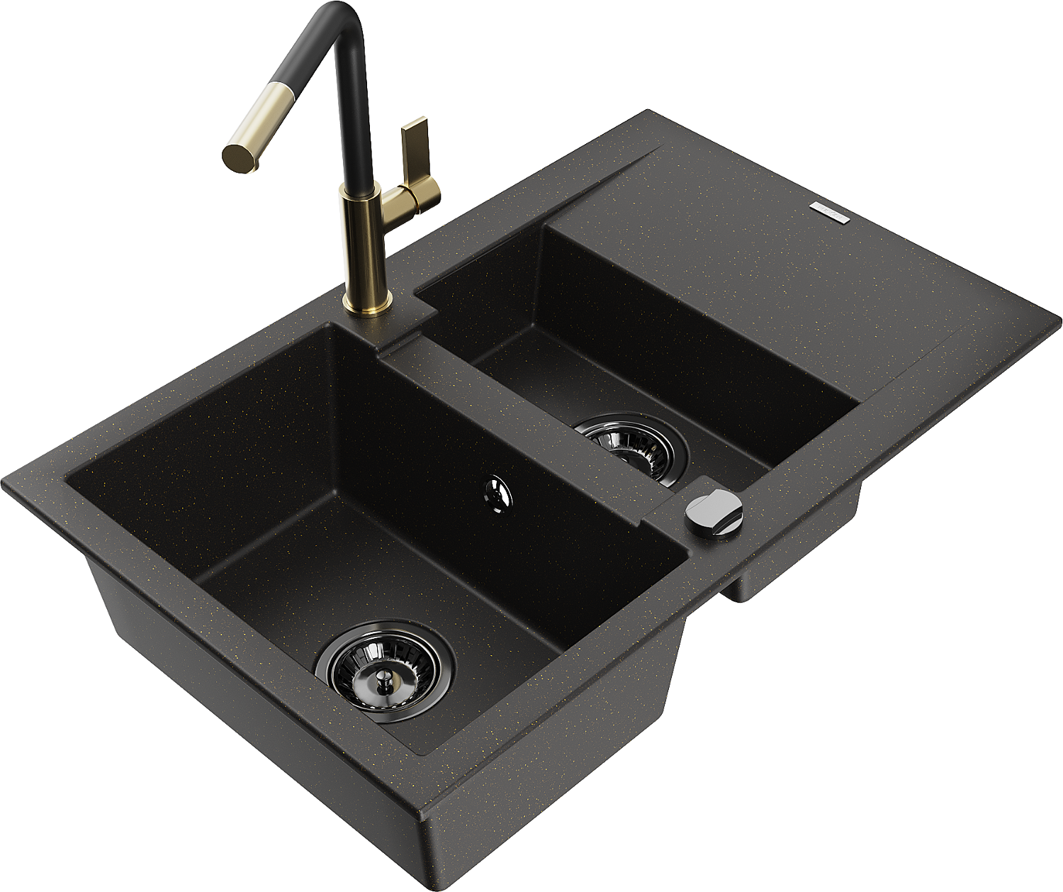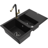 Mexen Gaspar granieten gootsteen 1,5-komor met afdruipplaat en keukenkraan Flora, zwart/goud - 6507-75-670401-57-B