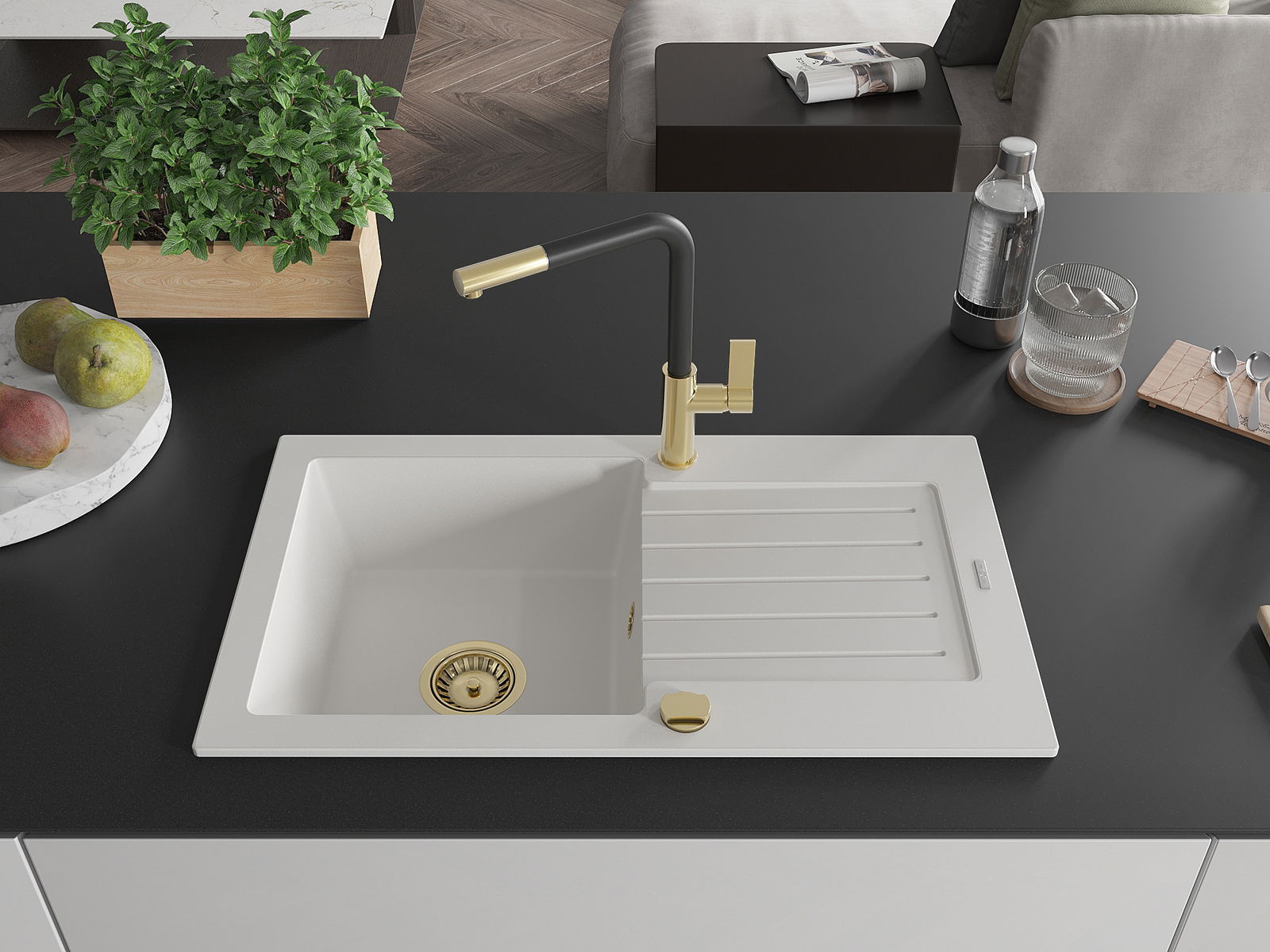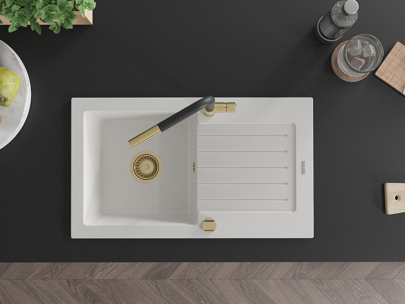 Mexen Pablo granieten spoelbak met 1 bak, afdruipruimte en keukenmengkraan Flora, wit - 6510-20-670401-57-G