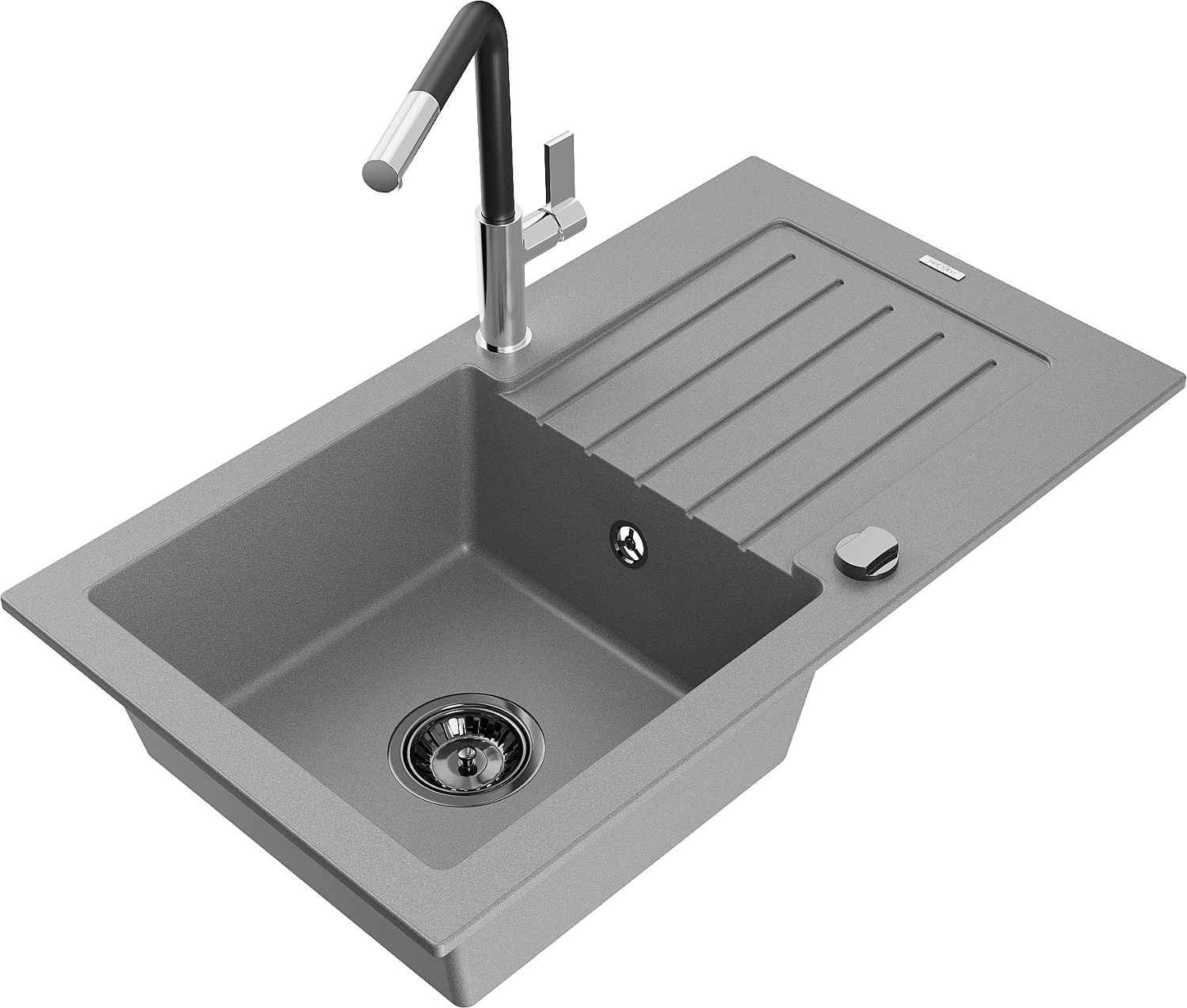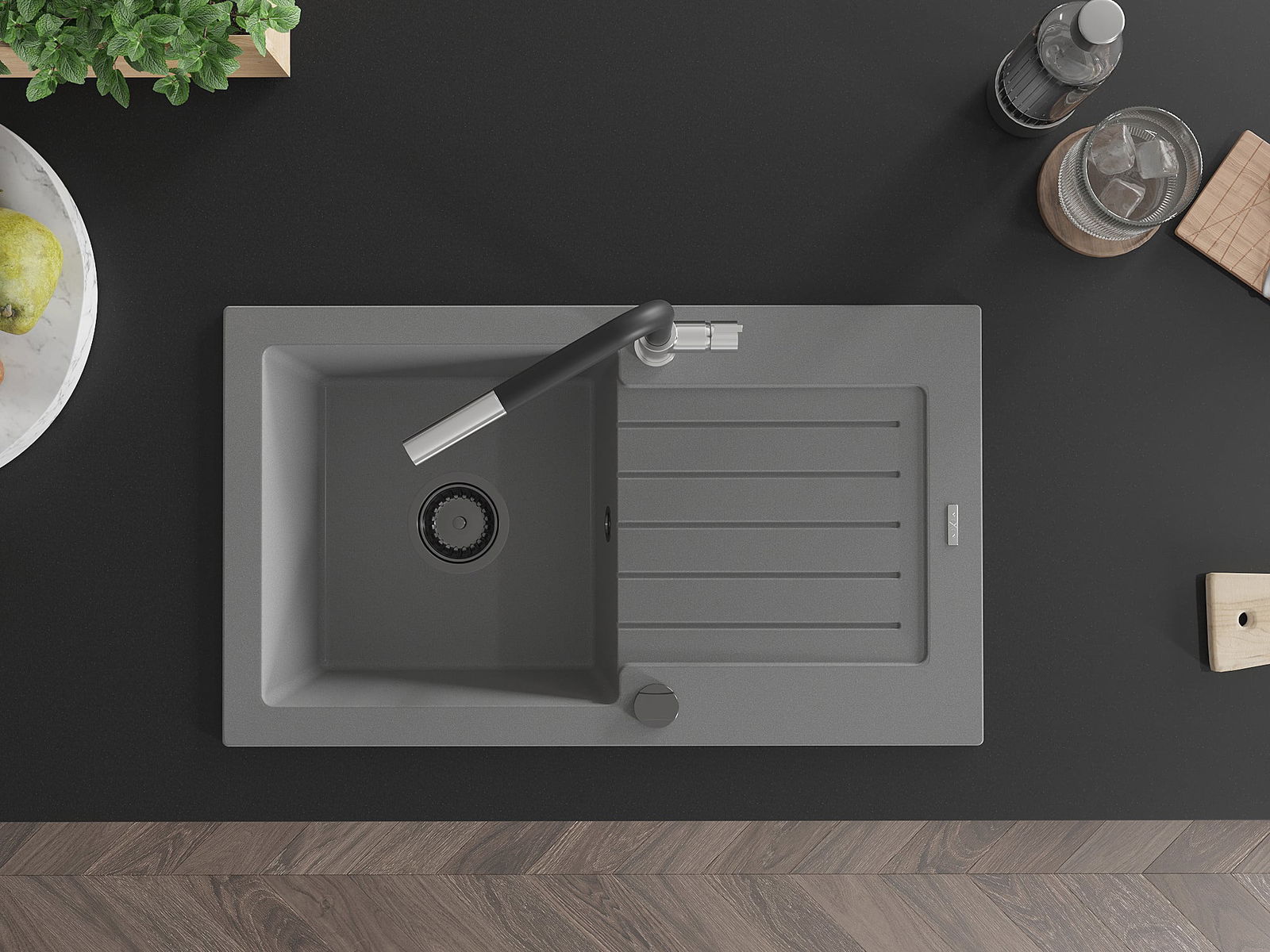 Mexen Pablo granieten gootsteen, 1-kompartement met afdruiprek en keukenmengkraan Flora, grijs - 6510-71-670401-07-B