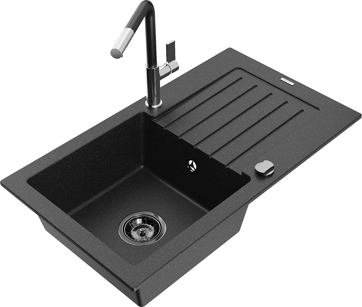 Mexen Pablo granieten gootsteen 1-komorige met afdruiprek en keukenmengkraan Flora, zwart/zilver metallic - 6510-73-670401-07-B