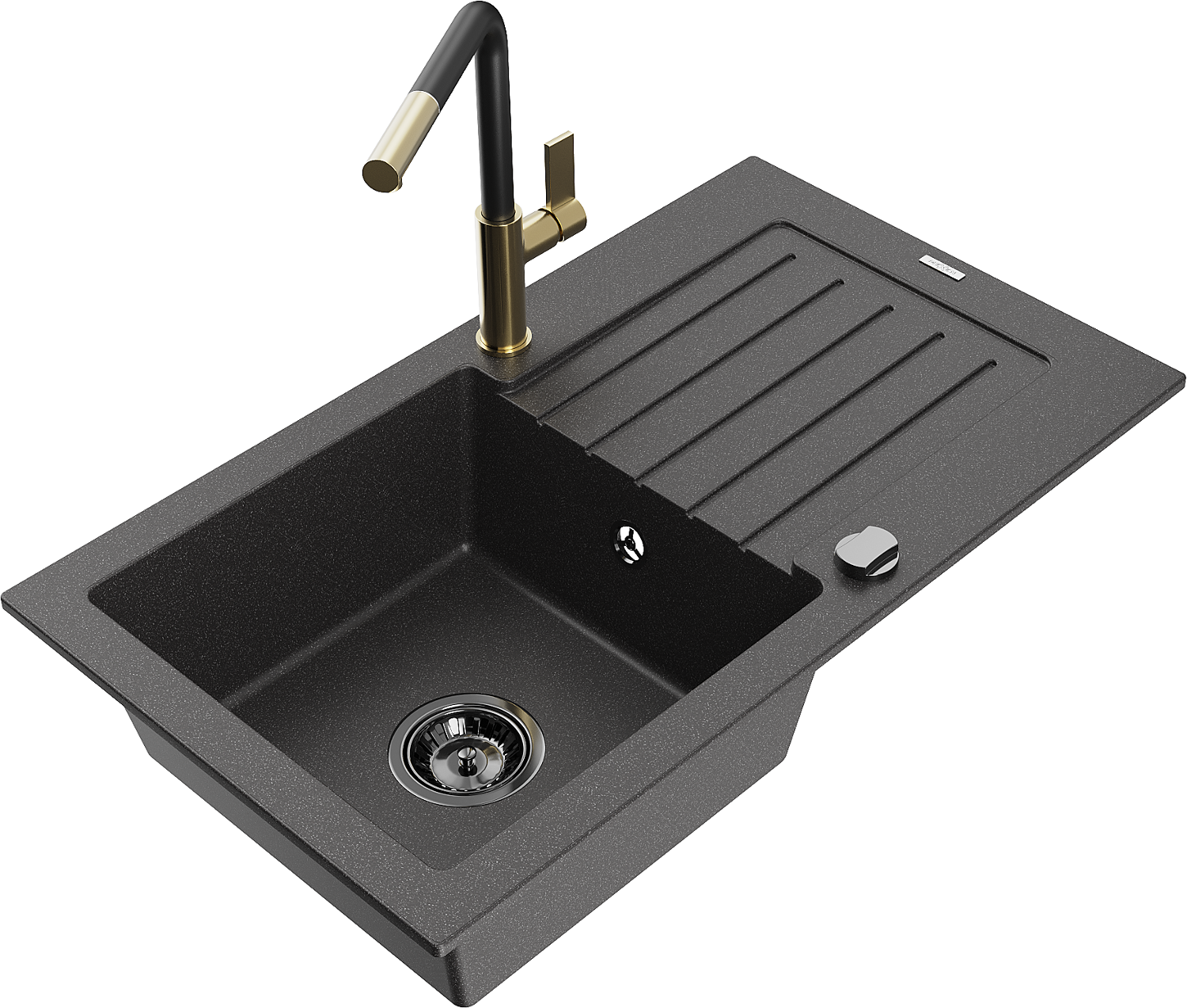 Mexen Pablo granieten gootsteen 1-kompartment met afdruiprek en keukenmengkraan Flora, zwart gespikkeld - 6510-76-670401-57-B