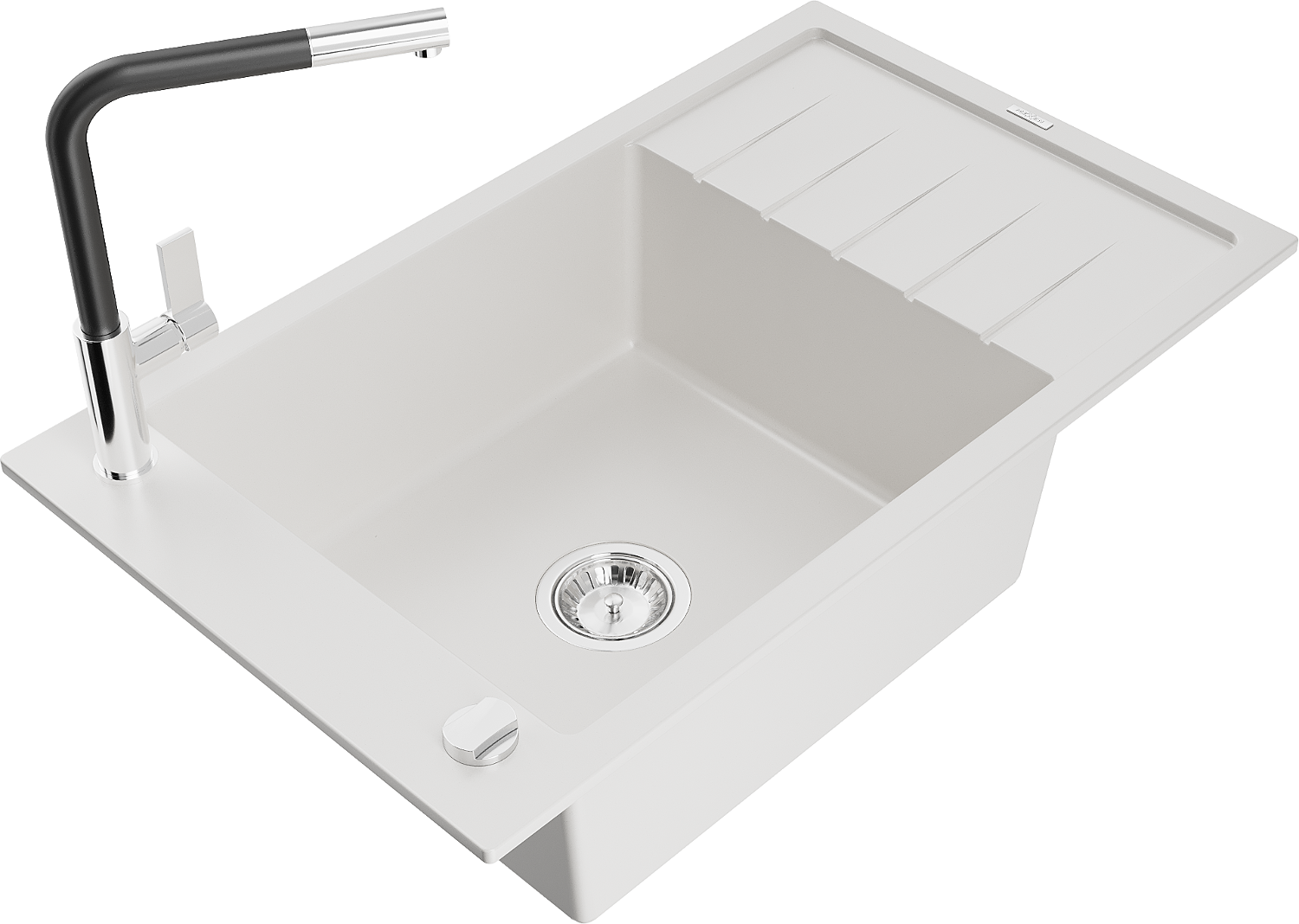 Mexen Elias granieten gootsteen 1-komorige met afvoerbak en keukenmengkraan Flora, wit - 6511-20-670401-07