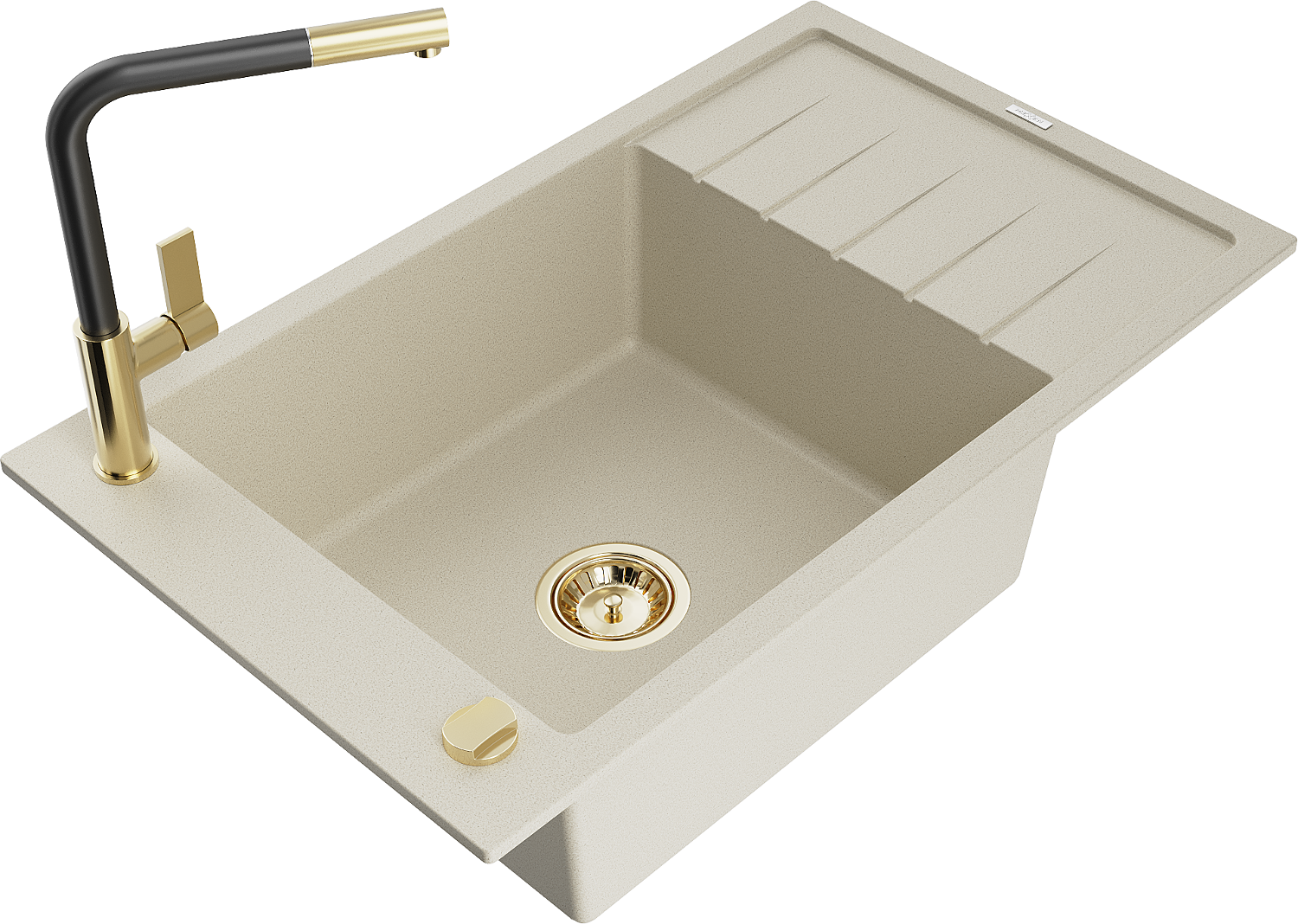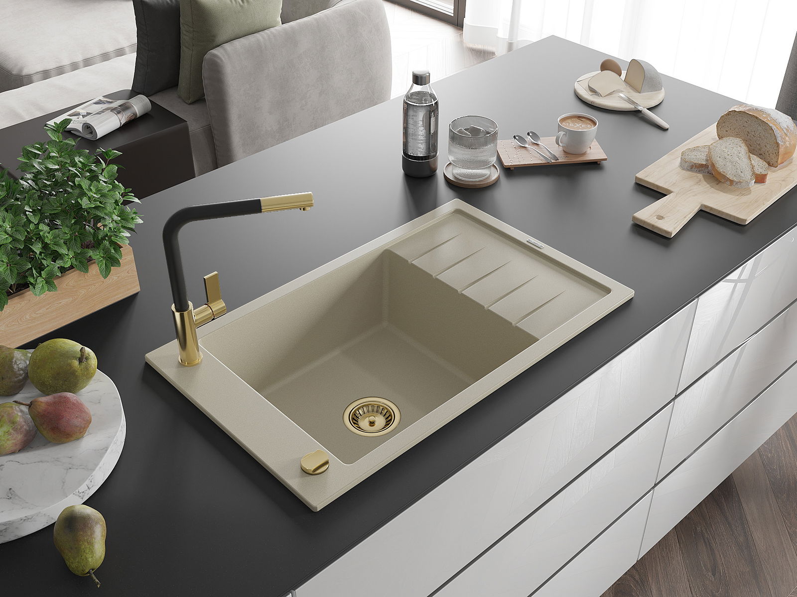 Mexen Elias granieten spoelbak 1-kompartment met afdruiprek en keukenmengkraan Flora, beige - 6511-69-670401-57-G