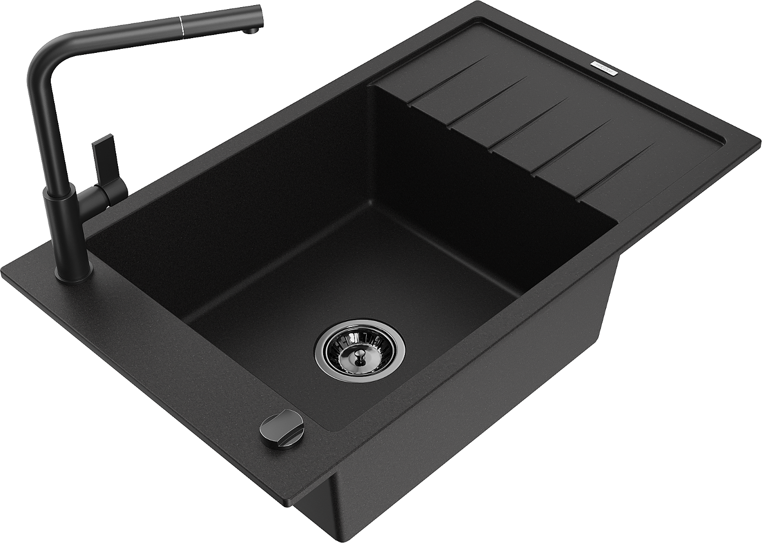 Mexen Elias granieten spoelbak 1-komers met afdruiprek en keukenkraan Flora, zwart - 6511-77-670401-70-B
