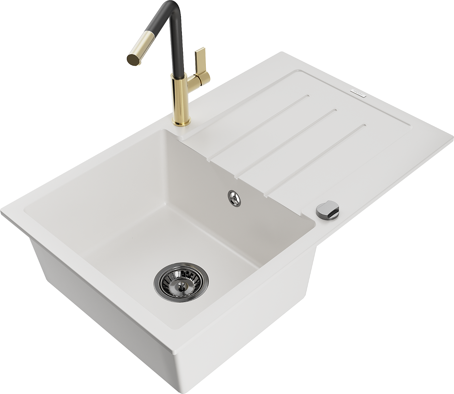 Mexen Bruno granieten gootsteen 1-kamer met afdruiprek en keukenkraan Flora, wit - 6513-20-670401-57-B