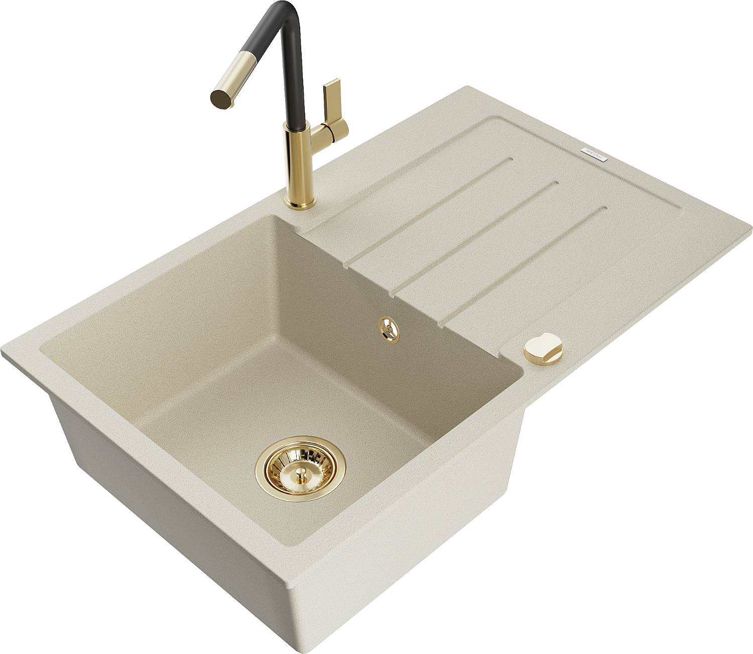 Mexen Bruno granieten gootsteen 1-komorige met afdruiprek en keukenkraan Flora, beige - 6513-69-670401-57-G