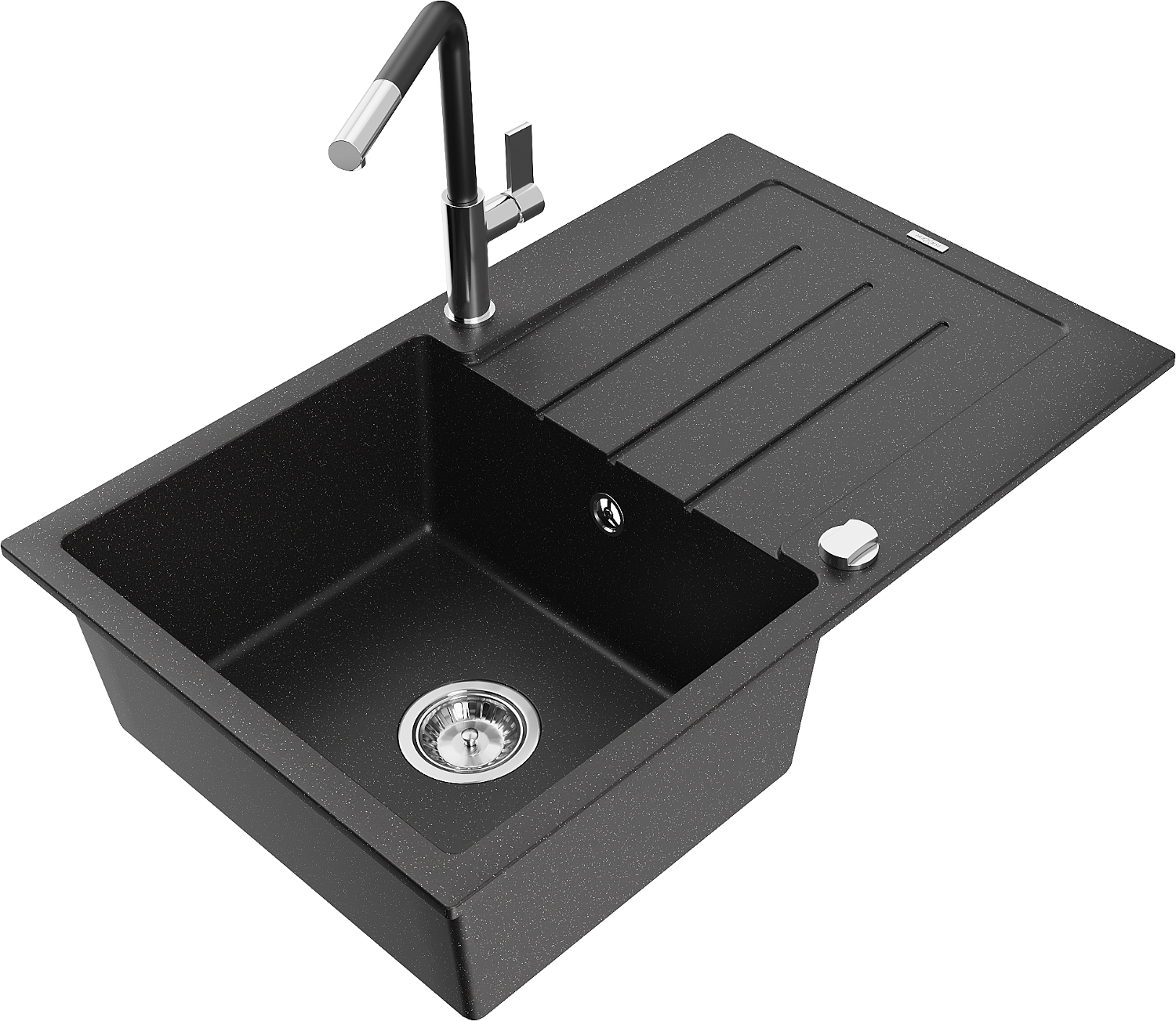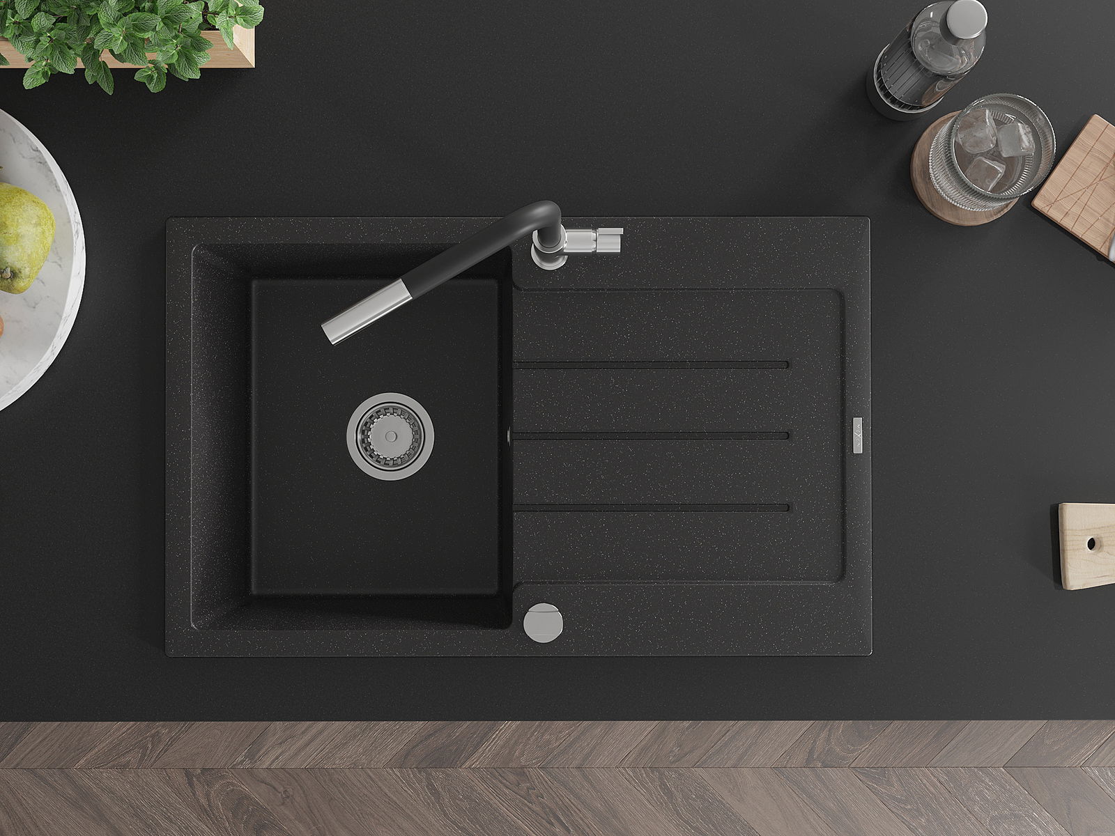 Mexen Bruno granieten spoelbak 1-komers met afdruiprek en keukenkraan Flora, zwart/zilver metallic - 6513-73-670401-07