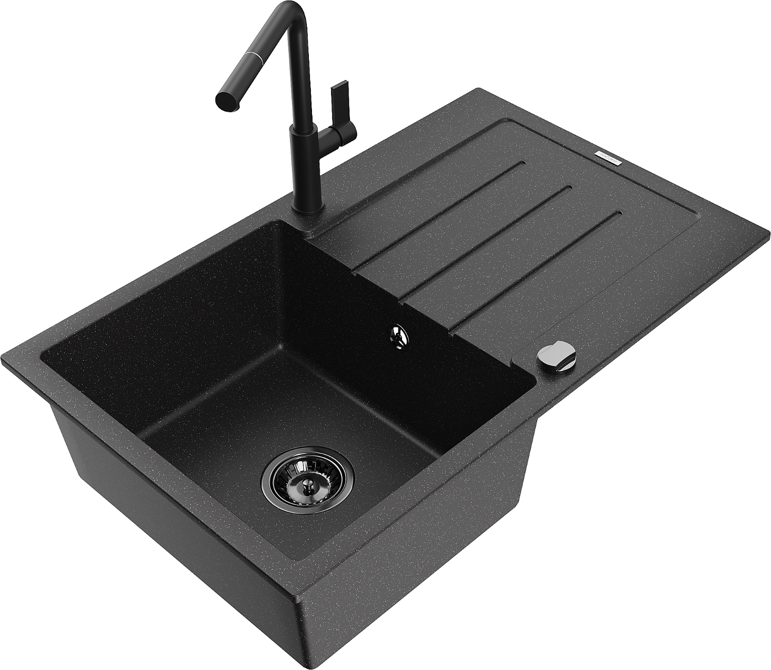 Mexen Bruno granieten spoelbak 1-komors met afdruipvlak en keukenmengkraan Flora, zwart/zilver metallic - 6513-73-670401-70-B